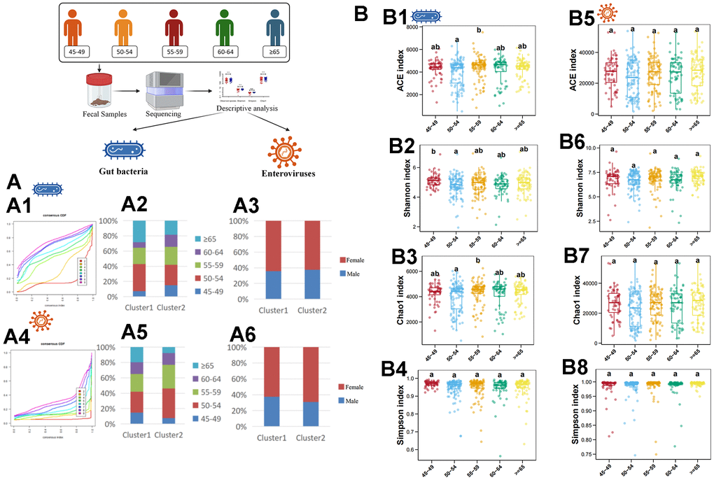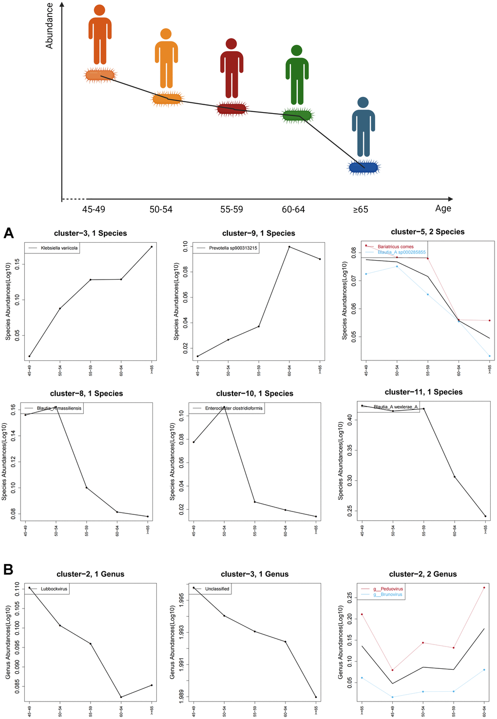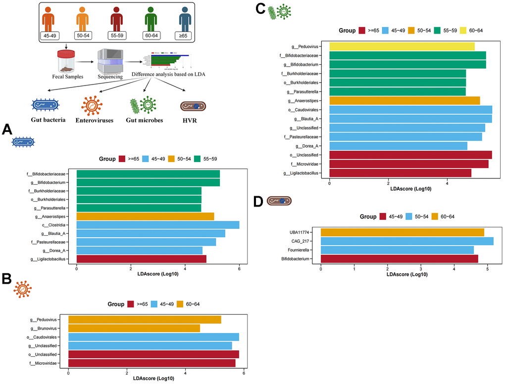 This study included a sample of 100 people over the age of 40. The data on the abundance of various gut microbes were obtained through PacBio sequencing. First, characteristic gut bacteria and characteristic enteroviruses in each age group (45-49, 50-54, 55-59, 60-64, ≥65) were found. Then, for these characteristic gut microbes, the trends in their abundance with respect to age were plotted. It was discovered that the abundance of gut microbes such as Blautia_A massiliensis, Blautia_A wexlerae_A and Enterocloster clostridioformis decreased with age. The abundance of gut microbes, including Klebsiella variicola, Prevotella and Lubbockvirus, increased with age. At the same time, a joint analysis of gut bacteria and enteroviruses was performed. Finally, it was found that some gut microbes (Limosilactobacillus, Parasutterella and Bifidobacterium, etc.) were more different among 5 groups.