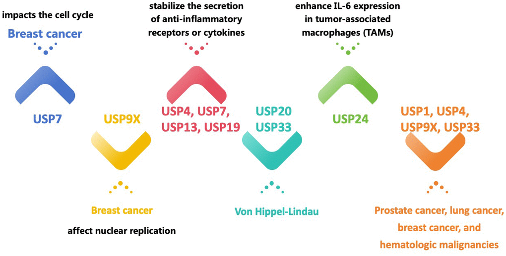 The USPs family is the most recognized group of DUBs, characterized by a wide range of structural and functional variability [23]. The distinguishing features of USPs include the unique catalytic core, known as the histidine and cysteine boxes, as well as the presence of zinc finger domains, ubiquitin-binding domains, or ubiquitin-like domains at the N and/or C-termini of the catalytic domain [21]. Protein degradation or oversynthesis is associated with malignancy’s development, spread, or growth. In this regard, a growing body of research has shown that USPs exert an influence on cancer progression through their ability to regulate and promote the growth of cancerous cells [12, 23, 24] (Figure 1). Previous studies have connected USPs, such as USP7 [25], USP21, USP22, USP33 [26], USP39, USP54 [27], and others, to carcinogenesis in several cancer types. While USP7 affects the cell cycle of breast cancer, which regulates its growth [28], USP9X influences breast cancer growth by influencing nuclear replication [29]. Additionally, USP9X controls mitosis, cell death, and treatment resistance in aggressive B-cell lymphomas [30]. Studies have indicated that the pathophysiology of Von Hippel-Lindau Syndrome (VHL) is linked to USP20 and USP33 [31–33]. The association between USPs and cell signaling pathways in malignancies have been demonstrated in previous studies.