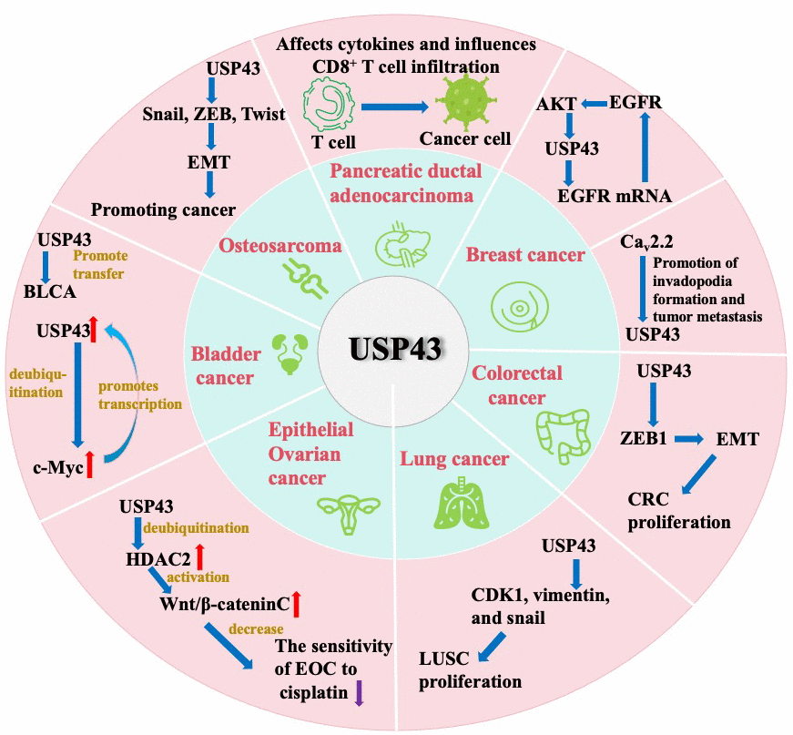 Studies in databases and clinicopathological specimens have confirmed that USP43 expression is significantly elevated in breast, pancreatic, lung, bladder, and epithelial ovarian cancers. Furthermore, the USP43 level is associated with poor prognosis and its involvement in different cancer pathways. USP43 potentially regulates cancer invasion by modulating EMT-associated transcription factors, such as ZEB1 or SNAIL, in breast cancer, colorectal cancer, and osteosarcoma. In breast cancer, USP43 promotes invasion and metastasis through invadopodia formation. In BLCA, USP43 promotes glycolysis and metastasis. In EOC, USP43 promotes the proliferation and impairs cisplatin sensitivity. Moreover, it may govern the duration of PDAC progression while facilitating CD8+ T cell infiltration. Additionally, USP43 can be employed in conjunction with other genes to predict lung cancer outcomes. Therefore, USP43 not only affects the proliferation and metastasis of tumors directly but also influences the immune microenvironment of some kinds of cancers, which affects their biological behavior (Figure 2 and Table 1).