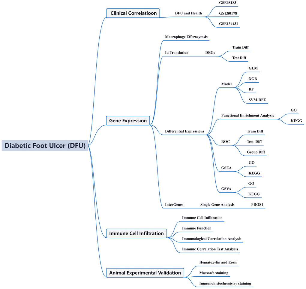 Through the use of clinical annotations and high-throughput transcriptome sequencing data, the Diabetic Foot Unit (DFU) program enables us to investigate alterations in transcriptional patterns and related molecular pathways linked to DFU in biological research [14]. Numerous researches have examined molecular markers linked to the development of DFU using gene expression data taken from the Gene Expression Omnibus (GEO) database [15, 16]. Advancements in high-throughput sequencing technologies and the incorporation of machine learning in medicine have led to the emergence of novel methodologies for investigating molecular targets across various diseases [14, 17]. Through the application of bioinformatics technology, genes related to DFU that are associated with macrophage efferocytosis have been identified. In order to accurately identify the biomarkers associated with DFU, we utilized machine learning algorithms and screened key gene models.