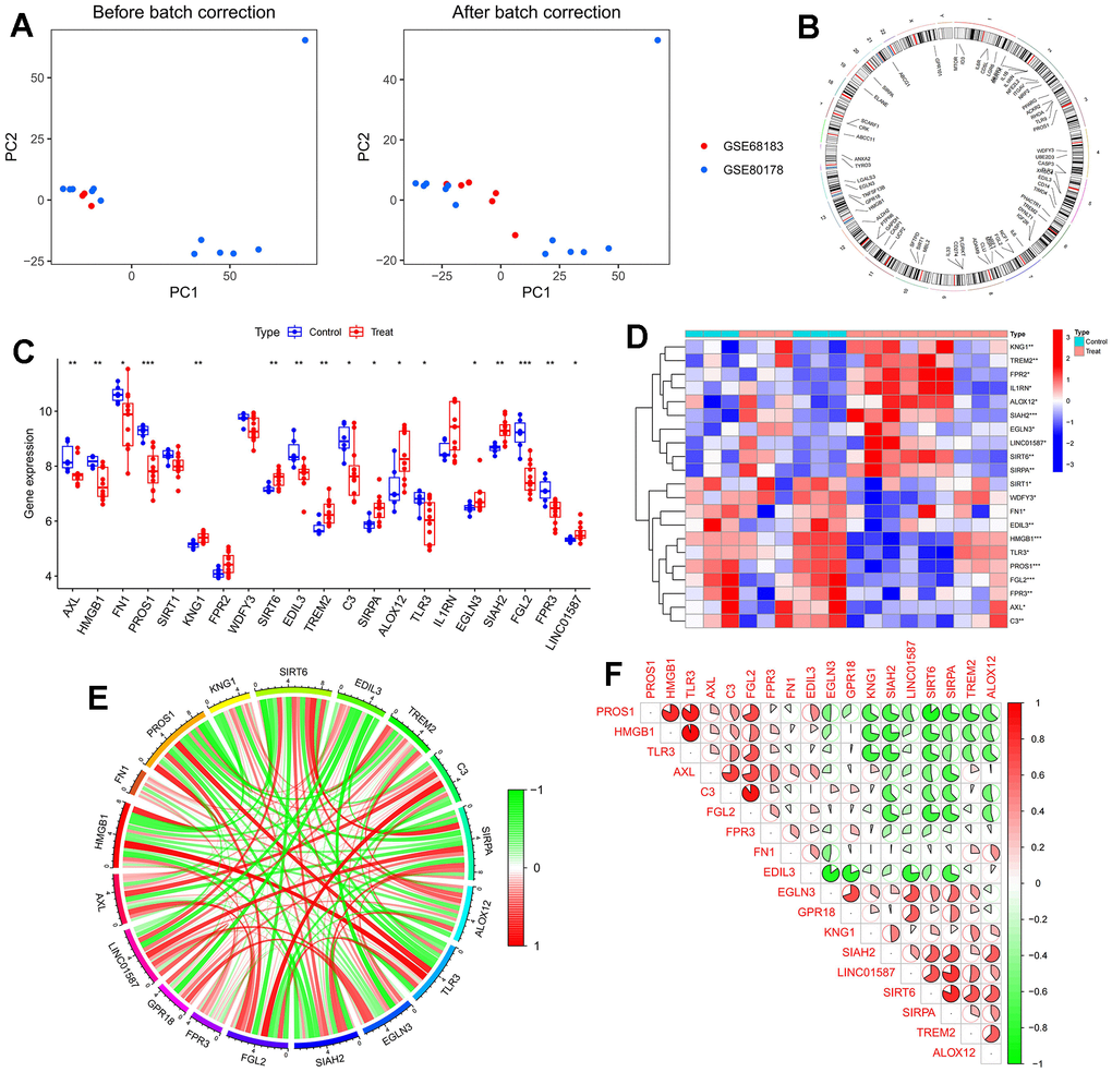 In this paper, we merged two DFU datasets, GSE68183 and GSE80178, and the datasets included a total of 6 normal skin samples and 12 DFU samples. In Figure 2A, we show the gene expression level assessment and PCA results of each sample before and after removing the batch effect. In Figure 2B, we calculated the chromosomal locations of MERGs and indicated them with circles. We identified 21 differentially expressed MERGs (deMERGs). Among these MERGs, KNG1, TREM2, FPR2, IL1RN, ALOX12, SIAH2, EGLN3, LINC01587, SIRT6, and SIRPA were expressed at higher levels in DFU. In contrast, SIRT1, WDFY3, FN1, EDIL3, HMGB1, TLR3, PROS1, FGL2, FPR3, AXL, and C3 were expressed at significantly lower levels in DFUs than in normal controls (see Figure 2C, 2D). Subsequently, correlation analysis of these genes was performed in this paper (see Figure 2D, 2E).