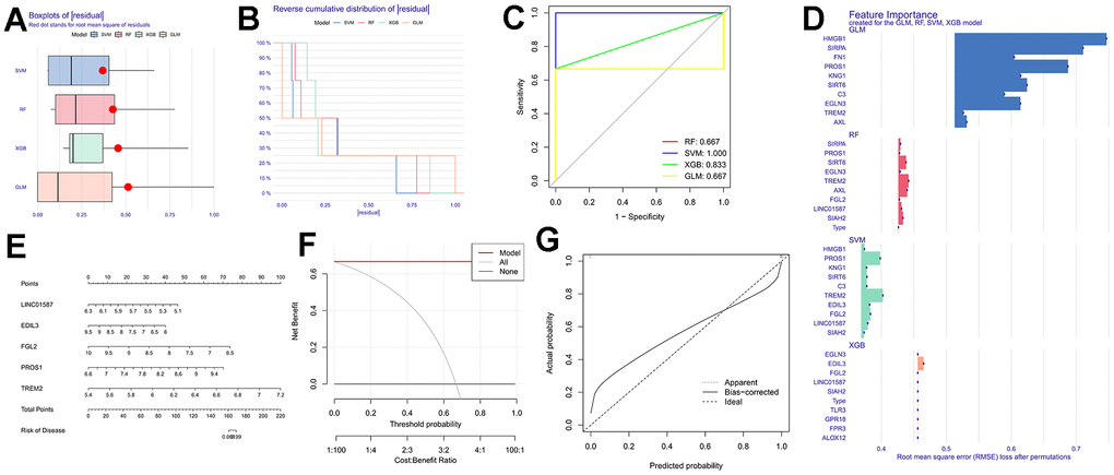 In this study, a machine learning model was constructed utilizing deMERGs (refer to Figure 3A). Residual distribution analysis indicated that SVM exhibited the highest residuals among the four models (see Figure 3B). ROC analysis demonstrated that SVM achieved an AUC value of 1.000, outperforming the other machine learning models (see Figure 3C). Figure 3D presented the top 10 significant feature variables for each model based on root mean square error. To assess the predictive performance of SVM models (LINC01587, EDIL3, FGL2, PROS1, and TREM2), line plots were plotted (see Figure 3E). Detailed model information can be found in Table 2. Prediction accuracy of the line plot models was evaluated using calibration curves and decision curve analysis (DCA). Calibration curves illustrated the minimum error between actual DFU cluster risk and predicted risk (see Figure 3F). Decision curve analysis demonstrated high accuracy of the line graphs, making them valuable for clinical decision-making (see Figure 3G).