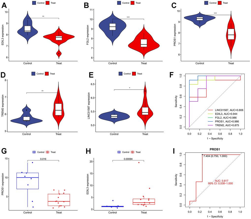 In the training set, we observed higher expression levels of EDIL3 (Figure 4A), FGL2 (Figure 4B), and PROS1 (Figure 4C) in the normal group, whereas TREM2 (Figure 4D) and LINC01587 (Figure 4E) showed higher expression levels in the DFU group. The ROC curves for these genes are depicted in Figure 4F. In the variance analysis of the validation set, we found that PROS1 (Figure 4G) expression was down-regulated in DFU, consistent with the results from the training set, while the expression pattern of EDIL3 (Figure 4H) was opposite to that observed in the training set. Consequently, PROS1 may serve as a key marker in DFU. The ROC curves of PROS1 in the validation set also demonstrated its strong diagnostic ability (Figure 4I).