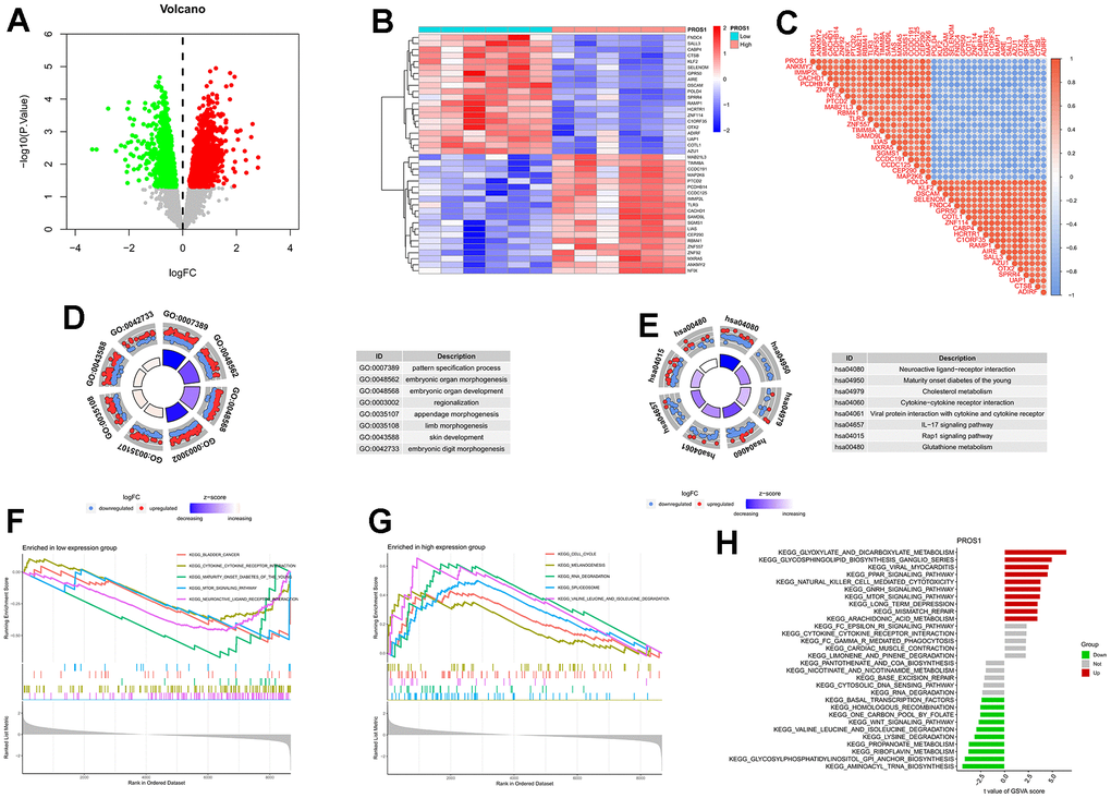 Based on the expression levels of PROS1, we conducted a differential analysis of genes in the training set. The results of this analysis were visualized through volcano plots (Figure 5A), heat maps (Figure 5B), and correlation heat maps (Figure 5C). Enrichment analysis revealed genetic biological processes involving pattern specification (GO: 0007389), embryonic organ morphogenesis (GO: 0048562), and embryonic organ development (GO: 0048568) (Figure 5D). KEGG enrichment analysis indicated that differentially expressed genes were implicated in pathways such as the IL-17 signaling pathway (hsa04657), Rap1 signaling pathway (hsa04015), and hedgehog signaling pathway (Figure 5E), suggesting a close association between PROS1 and inflammation. GSEA analysis demonstrated that the cell cycle, melanogenesis, and RNA degradation pathways were activated in the PROS1 high-expression group (Figure 5F). Conversely, in the PROS1 low-expression group, pathways related to bladder cancer, cytokine-cytokine receptor interactions, and youth maturity-onset diabetes were active (Figure 5G). GSVA analysis further indicated that PROS1 was closely linked to glyoxylate and dicarboxylic acid metabolism, as well as aminoacyl tRNA biosynthesis (Figure 5H).