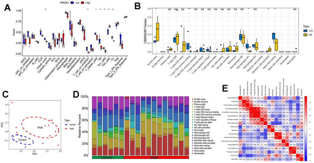 Immunofunctional analyses revealed that PROS1 may be associated with immune checkpoints, T-cell synergistic suppression, T-helper cells, Tfh, Th1 cells, Th2 cells, and tumor-infiltrating lymphocytes (TILs) (Figure 6A). Compared to controls, DFU samples exhibited an increase in B-cell naïve and dendritic cell-activated phenotypes, along with a decrease in the number of T-cells CD4 memory-resting, regulatory T-cells (Tregs), follicular helper T-cells, macrophage M1, and resting mast cells (Figure 6B). The distribution of immune cells and the results of principal component analysis (PCA) are illustrated in Figure 6C, while the distribution of immune cells is demonstrated in Figure 6D. Further analysis of the relationship between the 22 immune cells in all samples revealed a significant positive correlation between macrophage M1 and T-cell CD4 memory resting phenotypes, whereas B-cell naïve phenotypes exhibited a significant negative correlation with macrophage M2 (Figure 6E).
