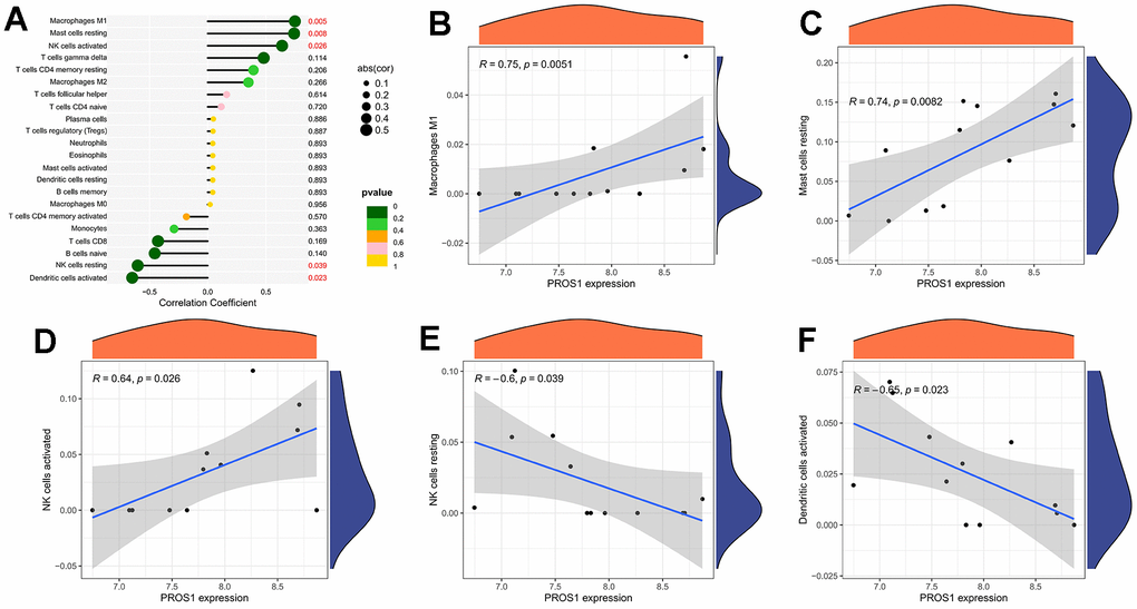 The correlation analysis between the gene PROS1 and immune cells is depicted in Figure 7A. We observed significant positive correlations between PROS1 and macrophage M1 (r = 0.74, p = 0.005) (Figure 7B), resting mast cells (r = 0.75, p = 0.008) (Figure 7C), and activated NK cells (r = 0.64, p = 0.03) (Figure 7D). Additionally, PROS1 exhibited a negative correlation with resting NK cells (r = -0.65, p = 0.02) (Figure 7E) and activated dendritic cells (r = -0.60, p = 0.04) (Figure 7F).