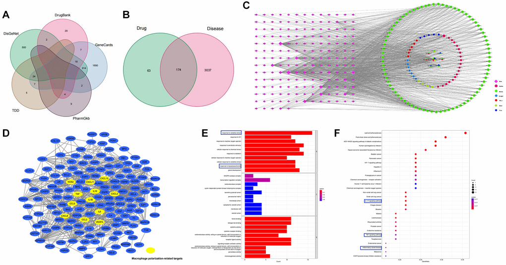 We used the same oral bioavailability (≥30%) and drug-likeness (≥0.18) thresholds that most researchers use to screen the active components of CSD in the Traditional Chinese Medicine System Pharmacology Database (TCMSP) [24]. The corresponding gene targets of these active components were then identified in TCMSP, and the UniProt knowledge database was used to transform these targets into Homo sapiens gene symbols. We sifted through UC-related disease genes from five databases, including GeneCards, DisGeNet, PharmGkb, Therapeutic Target Database (TTD), and DrugBank. The R software and scripts generated the Venn map of disease-drug-related genes. Based on this, Cytoscape software built the CSD regulatory network for UC treatment, and the STRING database constructed a protein-protein interaction (PPI) network with a high confidence score (≥0.9), manually integrating genes associated with macrophage polarization. The Gene Ontology (GO) and Kyoto Encyclopedia of Genes and Genomes (KEGG) pathway enrichment analyses were performed using R software to investigate the biological functions related to potential targets.