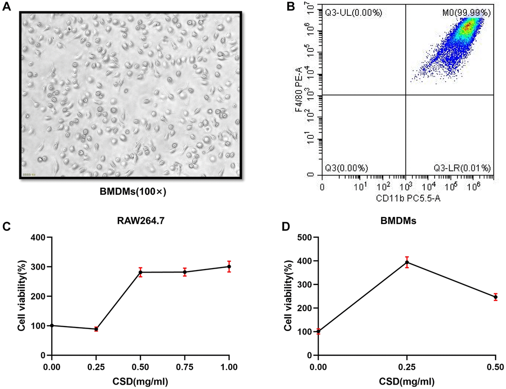 BMDMs and RAW264.7 cells were used for experiments to study in vitro macrophage polarization. First, identifying the induced BMDMs using the microscope on the seventh day of induction, the cell morphology was fusiform with two open ends (Figure 2A). Flow cytometry revealed that the proportion of CD11b+F4/80+ cells reached 99.99% (Figure 2B), indicating successful induction of BMDMs [28]. Count Kit 8 (CCK8) test was then performed on RAW264.7 cells to test cell viability. The findings revealed that CSD did not significantly reduce the cell viability at 0.25 mg/mL and 0.5 mg/mL for 6 h after intervention (Figure 2C), nor did it affect the cell viability in BMDMs (Figure 2D). Therefore, 0.25 mg/mL was selected as the low-dose CSD (CSDL) group and 0.5 mg/mL as the high-dose (CSDH) group.