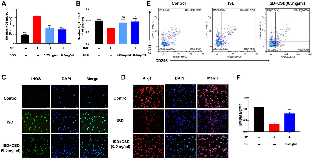 In vitro experiments were performed first to confirm the effect of CSD on macrophage polarization. iNOS is an M1 macrophage marker, while Arg1 is an M2 macrophage marker [29]. After ISD stimulation, the level of iNOS mRNA increased while Arg1 mRNA decreased in RAW264.7 cells. However, the addition of CSD intervention could reverse this effect, particularly at a concentration of 0.5 mg/mL (Figure 3A, 3B). The expression of iNOS and Arg1 in cell fluorescence assay was identical (Figure 3C, 3D). Flow cytometry also revealed that the M2/M1 ratio of BMDMs decreased after ISD induction but increased after CSD addition (Figure 3E, 3F). These findings suggested that CSD could regulate ISD-induced macrophage polarization in vitro.
