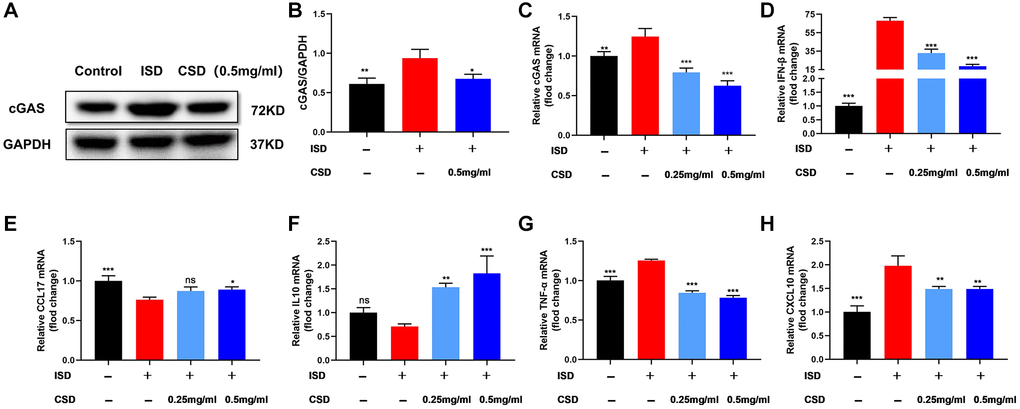 We detected the expression of cGAS, a protein associated with macrophage polarization, to further explore the mechanism by which CSD regulates macrophages. Findings of WB and PCR revealed that ISD induced the expression of cGAS protein and mRNA in RAW264.7 macrophages, and the expression decreased after CSD intervention (Figure 4A–4C). IFN-β is an inflammatory factor in the complex downstream pathway of cGAS [30], and its mRNA level is correlated with cGAS expression (Figure 4D). The mRNA levels of CCL17, IL10, TNF-α, and CXCL10 were used to assess ISD-induced macrophage inflammation. The results revealed that ISD decreased the mRNA levels of anti-inflammatory factors CCL17 and IL10 while increasing the inflammatory factors TNF-α and CXCL10, and CSD changed the outcome (Figure 4E–4H). These findings imply that CSD may regulate macrophage polarization and inhibit inflammation by inhibiting cGAS.