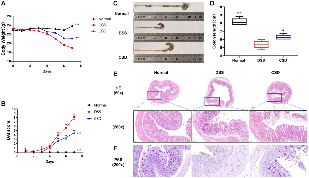 A DSS-induced colitis model was established to study the effects of CSD on the symptoms and pathological changes of UC mice, and CSD was given by gavage on this basis. CSD treatment of DSS-induced UC in mice reduced intestinal bleeding, stabilized stool traits, and increased body weight (Figure 5A). It decreased cumulative (DAI) score (Figure 5B). Inflammation can shorten the colon. The colon length increased significantly after CSD treatment compared to the DSS group (Figure 5C, 5D). In DSS-induced mice, HE staining revealed intestinal pathological injury, intestinal structure destruction, and increased inflammatory infiltration (Figure 5E). The observation of changes in goblet cell number was an important morphological basis for intestinal structural changes [31]. AB/PAS staining demonstrated a depletion in the number of intestinal goblet cells in the DSS group compared to the control group. However, this depletion was reduced after CSD intervention (Figure 5F). These findings imply that CSD could alleviate the progression of DSS-induced UC.