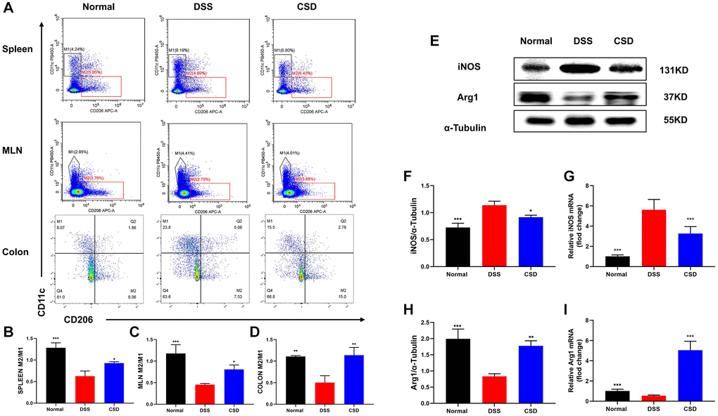 The spleen, mesenteric lymph nodes, and intestine are all important immune system components, and the UC lesion site is in the intestine. Therefore, we focused on detecting macrophage polarization in these sites to investigate the effect of CSD on UC mice. Compared to the control group, DSS could induce macrophages to differentiate into inflammatory phenotypes (M1), and M2/M1 decreased, whereas CSD significantly increased this ratio (Figure 6A–6D). We measured the protein and mRNA levels of iNOS and Arg1 in intestinal tissues, indicating that CSD could lower the content of iNOS while increasing Arg1 in intestinal tissues after DSS-induced UC (Figure 6E–6I). These findings suggest that CSD regulates DSS-induced macrophage polarization in UC mice.