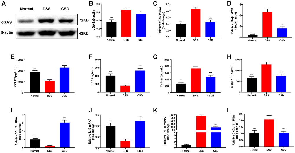 As previously stated, ISD could activate cGAS to induce inflammatory tendencies in macrophages. Therefore, we were interested in whether DSS could influence changes in intestinal inflammation levels in vivo by inducing cGAS expression. WB and PCR results revealed that cGAS expression was increased in the DSS group compared to the control group, and the relative content of IFN-β mRNA was increased, which could significantly inhibit their expression after CSD administration (Figure 7A–7D). The levels of inflammation-related factors in the intestine were measured using ELISA and PCR. Compared with the normal group, CCL17, and IL10 expression decreased in the DSS group, and CSD treatment significantly increased their levels (Figure 7E, 7F, 7I, 7J). However, TNF-α and CXCL10 increased significantly after DSS induction, and CSD could significantly reduce this result (Figure 7G, 7H, 7K, 7L). These findings suggest that CSD could regulate DSS-induced macrophage polarization in UC mice by inhibiting cGAS and alleviating intestinal inflammation.