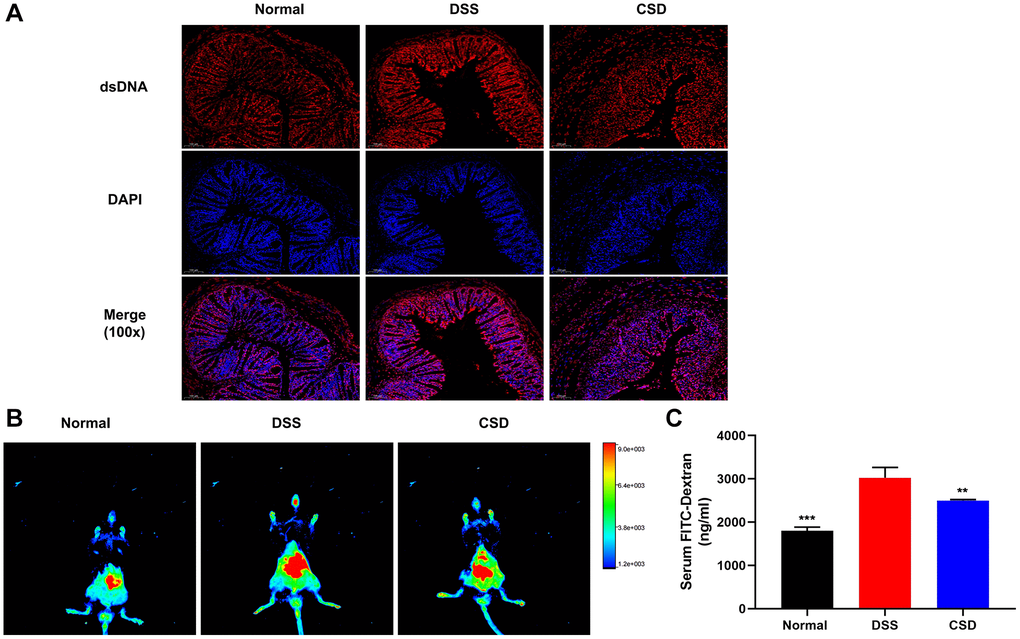The increase in intestinal permeability is mainly due to the breakdown of the intestinal epithelial barrier, which is a key link in the pathogenesis of UC. Normal epithelium can keep harmful substances out of the intestine while effectively absorbing nutrients. However, permeability increases, and the opportunity for pathogens to invade the intestinal cavity increases, aggravating intestinal damage and inflammation [47]. Therefore, we determined the intestinal distribution of FITC-Dex and its content in serum after intragastric administration. We identified that FITC-Dex was widely distributed in the intestine after mold creation, with greater absorption into the blood and strong intestinal permeability, and CSD could alter the outcome. M2 is a macrophage with a tissue repair function, and the influence of its increased proportion on intestinal tissue repair is being investigated further. When intestinal inflammation occurs, pathogenic bacteria break the DNA double-strand of the host, causing host cell DNA damage and dsDNA accumulation [48]. Extracellular vesicles (EVs) from damaged colonic epithelium carry dsDNA to activate the STING pathway of macrophages and cause inflammation [36]. We identified that dsDNA expression increased significantly after CSD intervention while dsDNA content decreased in UC colon tissue. The results revealed that DSS induced intestinal DNA damage in UC mice, but CSD can reduce DNA damage and repair the intestinal barrier.