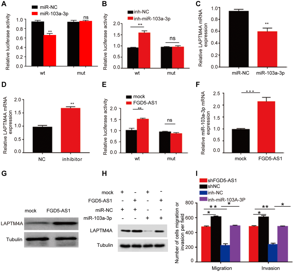 Subsequently, leveraging the miRNet and starBase databases, we employed predictive analysis to identify potential regulatory relationships between hsa-miR-103a-3p and long non-coding RNAs (lncRNAs) (Supplementary Figure 9G). A scatter plot analysis revealed LAPTM4A exhibited a statistically significant positive correlation with FGD5-AS1 (r = 0.381) (Supplementary Figure 9H). Similarly, FGD5-AS1 as the most significantly correlated lncRNA with miR-103a-3p (r = −0.318) (Supplementary Figure 9I). Encouragingly, potential binding sites between FGD5-AS1 and miR-103a-3p were predicted, further leading to mutations in FGD5-AS1 mRNA (Supplementary Figure 9J). Notably, the dual-luciferase reporter gene system demonstrated that transfection of the FGD5-AS1 mimic successfully reduced relative luciferase activity in U251 cells transfected with wild-type hsa-miR-103a-3p, while no such reduction was observed in cells transfected with the corresponding mutant (Figure 10E). Additionally, over-expressed FGD5-AS1 decreased hsa-miR-103a-3p levels in U251 cells (Figure 10F). Furthermore, overexpression of FGD5-AS1 demonstrated an elevation in LAPTM4A levels in U251 cells (Figure 10G). Strikingly, the co-overexpression of FGD5-AS1 and hsa-miR-103a-3p effectively reversed the heightened expression levels of LAPTM4A (Figure 10H). Notably, Transwell assay results revealed a substantial inhibition in the invasion and migration capacities of U251 cells upon FGD5-AS1 knockdown, which could be rescued by the hsa-miR-103a-3p inhibitor (Figure 10I). Collectively, our findings illuminate the intricate regulatory mechanism governing LAPTM4A, underscoring the significance of the FGD5-AS1-hsa-miR-103a-3p-LAPTM4A axis in the regulation of glioma progression.