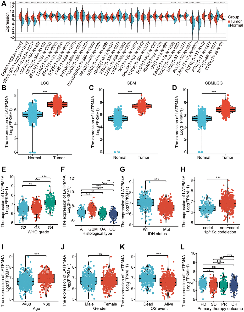 To determine the expression level of LAPTM4A, we conducted a comprehensive analysis of LAPTM4A mRNA levels using data from the TCGA and GTEx databases. Our results, as depicted in Figure 2A, demonstrated a significant increase in LAPTM4A expression in 16 different types of carcinomas, with particularly high expression observed in LGG, GBM, and GBMLGG. This upregulation of LAPTM4A in LGG, GBM, and GBMLGG was further confirmed by box diagrams displayed in Figure 2B–2D. Moreover, in order to establish the association between LAPTM4A expression in GBMLGG and various clinic parameters, we assessed LAPTM4A expression levels in different cohorts stratified by WHO grade, histological type, IDH status, 1p19q codeletion, age, gender, OS event, and primary therapy outcome, utilizing the TCGA and GTEx databases (Figure 2E–2L). Our analysis revealed a significant correlation between LAPTM4A expression and clinicopathological features, with the exception of gender (p < 0.01). Notably, LAPTM4A expression exhibited an increasing trend as the WHO grade advanced. Furthermore, LAPTM4A was found to be overexpressed in IDH wild-type cases when compared to IDH mutant cases, and higher expression levels were observed in 1p19q non-co-deletion as opposed to co-deletion. Collectively, these findings suggest that LAPTM4A expression is elevated in gliomas and holds promise as a potential biomarker for assessing glioma progression.