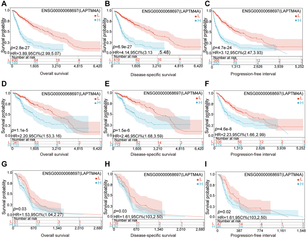 Considering its significant expression in LGG, GBM, and GBMLGG, the prognostic and diagnostic value of LAPTM4A was assessed. Utilizing the TCGA and GTEx databases, we calculated the correlation between LAPTM4A expression in LGG, GBM, and GBMLGG, and patient prognosis, including overall survival (OS), disease-specific survival (DSS), and progression-free interval (PFI). Our findings revealed a significant association between overexpression of LAPTM4A and poor OS (p = 2.8 e-27) and DSS (p = 6.9 e-27) as well as PFI (p = 4.7 e-24) in GBMLGG (Figure 3A–3C). Similarly, overexpression of LAPTM4A was associated with unfavorable OS (p = 1.1 e-6) and DSS (p = 1.5 e-6), and PFI (p = 4.8 e-6) in LGG (Figure 3D–3F), and correlated with poor OS (p = 0.03) and DSS (p = 0.03) and PFI (p = 0.02) in GBM (Figure 3G–3I). The validation of survival across all WHO grades of primary (p = 0.028) and recurrent glioma (p = 0.04) was performed using the CGGA database (Supplementary Figure 1A), yielding consistent results. Furthermore, the area under the ROC curve was 0.982, 0.992, and 0.984 in LGG, GBM, and GBMLGG, respectively, indicating superior diagnostic accuracy for LAPTM4A (Supplementary Figure 1B–1D). Subsequently, we developed a nomogram integrating the significant clinic parameters mentioned above to estimate the survivability of GBMLGG patients (Supplementary Figure 1E). The predictive performance of the nomogram was evaluated using calibration curves, which demonstrated close agreement between predicted and actual 1, 3, and 5-year survival durations (Supplementary Figure 1F). In conclusion, our findings support the conclusion that overexpression of LAPTM4A is predictive of an unfavorable prognosis in gliomas.