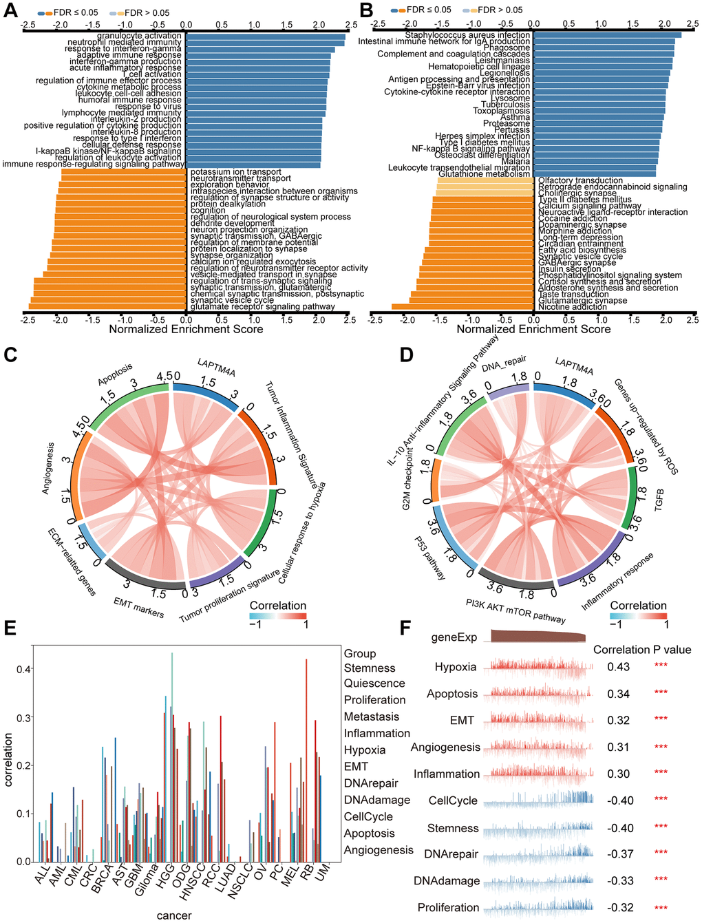 Given that LAPTM4A is a potential prognostic factor in glioblastoma, we are eager to unravel the involvement of LAPTM4A in the biological processes of gliomas. GO suggested that LAPTM4A may be involved in biological processes including neutrophil-mediated immunity, acute inflammatory response, interferon production, regulation of immune effector processes, and humoral immune response. Meanwhile, KEGG pathway enrichment analysis found that LAPTM4A had increased complement and coagulation cascades, phagocytic vesicles, antigen processing and presentation, cytokine-cytokine receptor interactions, and lysosomal pathways. These findings prompted great interest in the role played by LAPTM4A in tumor immunity.