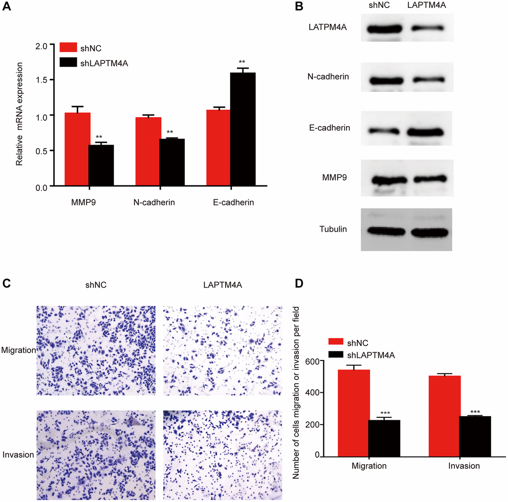 Previously, the Cancer Genome Atlas Network classified glioblastoma multiforme into four distinct molecular subtypes: proneural, neural, mesenchymal, and classical [40]. Mesenchymal GBM cells are known to exhibit enhanced motility and invasion, in addition to higher expression levels of proteins related to cell movement, as compared to epithelial tumor cells. To explore the expression discrepancies of LAPTM4A among these subtypes, we assessed LAPTM4A expression levels in the Bao, Phillips, and glioma Rembrandt datasets. Our findings showed that mesenchymal subtype gliomas express LAPTM4A more frequently than other subtypes (Supplementary Figure 4A–4C). We further conducted a ROC analysis to evaluate the diagnostic power of LAPTM4A on the mesenchymal phenotype, which yielded an AUC of 0.859, 0.815, and 0.790 for LAPTM4A in Bao [41], Phillips [42], and Rembrandt [43], respectively, indicating its strong diagnostic potential (Supplementary Figure 4D–4F). To corroborate these results, we performed plasmid-mediated knockdown of LAPTM4A in the U251 cell line and assessed the expression of key molecules involved in epithelial-mesenchymal transition (EMT), such as N-cadherin, E-cadherin, and MMP9, using qRT-PCR and Western blotting. Interestingly, LAPTM4A knockdown resulted in higher levels of E-cadherin protein expression, while simultaneously lowering the protein levels of N-cadherin and MMP9 (Figure 5A, 5B). As EMT programming has been implicated in the metastasis of malignant tumor cells originating from epithelial cells [44], we further explored the relationship between LAPTM4A expression and tumor metastasis using the Transwell assay. The results demonstrated that the knockdown of LAPTM4A inhibited the invasion and migration of glioblastoma cells (Figure 5C, 5D). Collectively, our findings suggest that suppression of LAPTM4A expression may hinder glioblastoma invasion and migration through the EMT pathway.