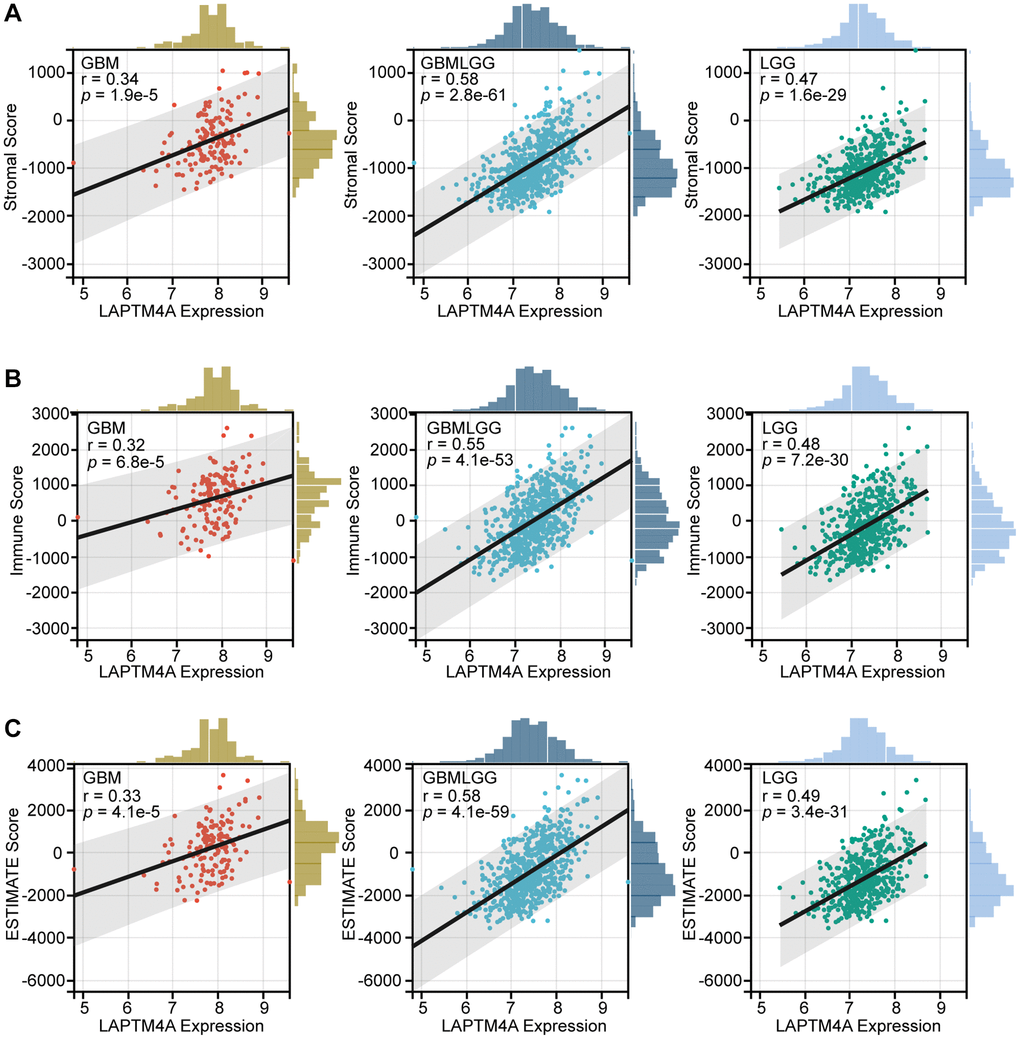 Furthermore, to elucidate the relationship between LAPTM4A expression and the degree of infiltration within LGG, GBM, and GBMLGG, we performed correlation studies using stromal scores, immune scores, and ESTIMATE scores obtained from the ESTIMATE method (Figure 6). The results demonstrated a positive association between LAPTM4A expression and immunological, stromal, and estimation scores across LGG, GBM, and GBMLGG, with a particularly noteworthy correlation observed in GBMLGG (correlation coefficient >0.5). These findings further support the notion that LAPTM4A is predominantly expressed in monocytes/macrophages and AC-like malignant cells, and is intricately linked to the tumor microenvironment in gliomas.