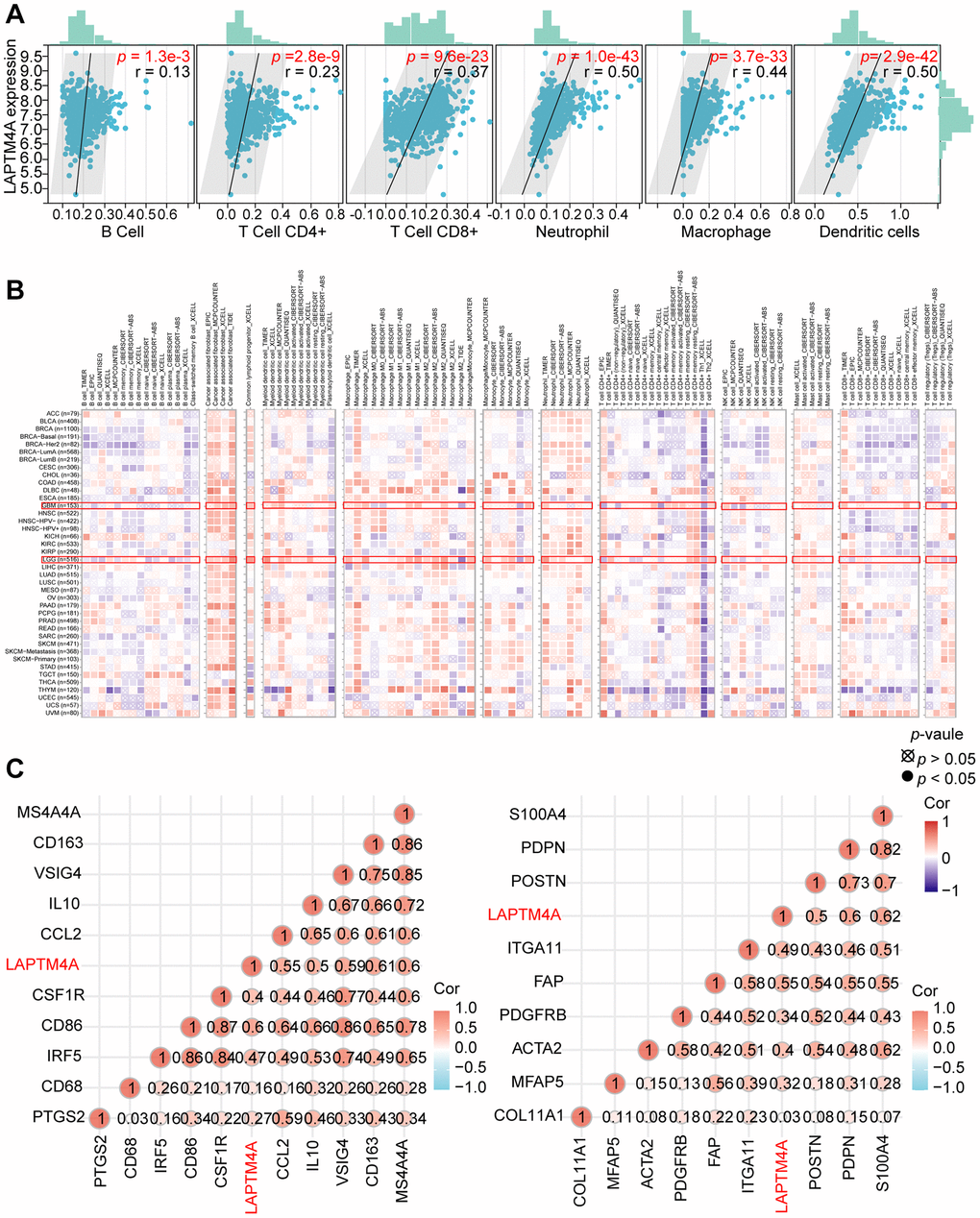 The intricate molecular compositions of both the internal and external tumor microenvironment, primarily comprised of immune and stromal cells alongside other associated cell types, play a crucial role in nurturing tumor growth. In order to identify the key cell types expressing LAPTM4A within the cancer microenvironment, we conducted a comprehensive single-cell analysis of LAPTM4A across 80 cancer sample datasets. By utilizing the TISCH online tool, we examined the expression levels of LAPTM4A in 34 distinct cell types, including immune cells, stromal cells, malignant cells, and functional cells, as depicted in the heatmap presented in Supplementary Figure 6A.