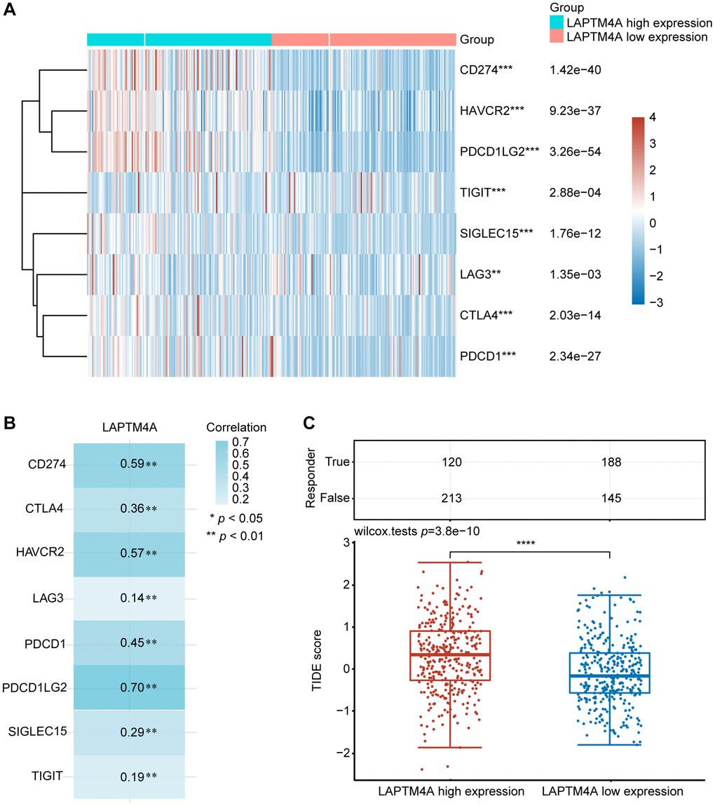 Immunotherapy has emerged as a pivotal approach in the management of carcinoma. To delve into the association between LAPTM4A and immunotherapy, we focused on the expression patterns of eight immune checkpoint (ICP) genes in relation to LAPTM4A expression levels. Our findings demonstrated that when LAPTM4A was highly expressed, there was a corresponding upregulation of immune checkpoint genes (Figure 8A, 8B). Notably, LAPTM4A exhibited a strong correlation with PDCD1LG2, CD274, and HAVCR2.