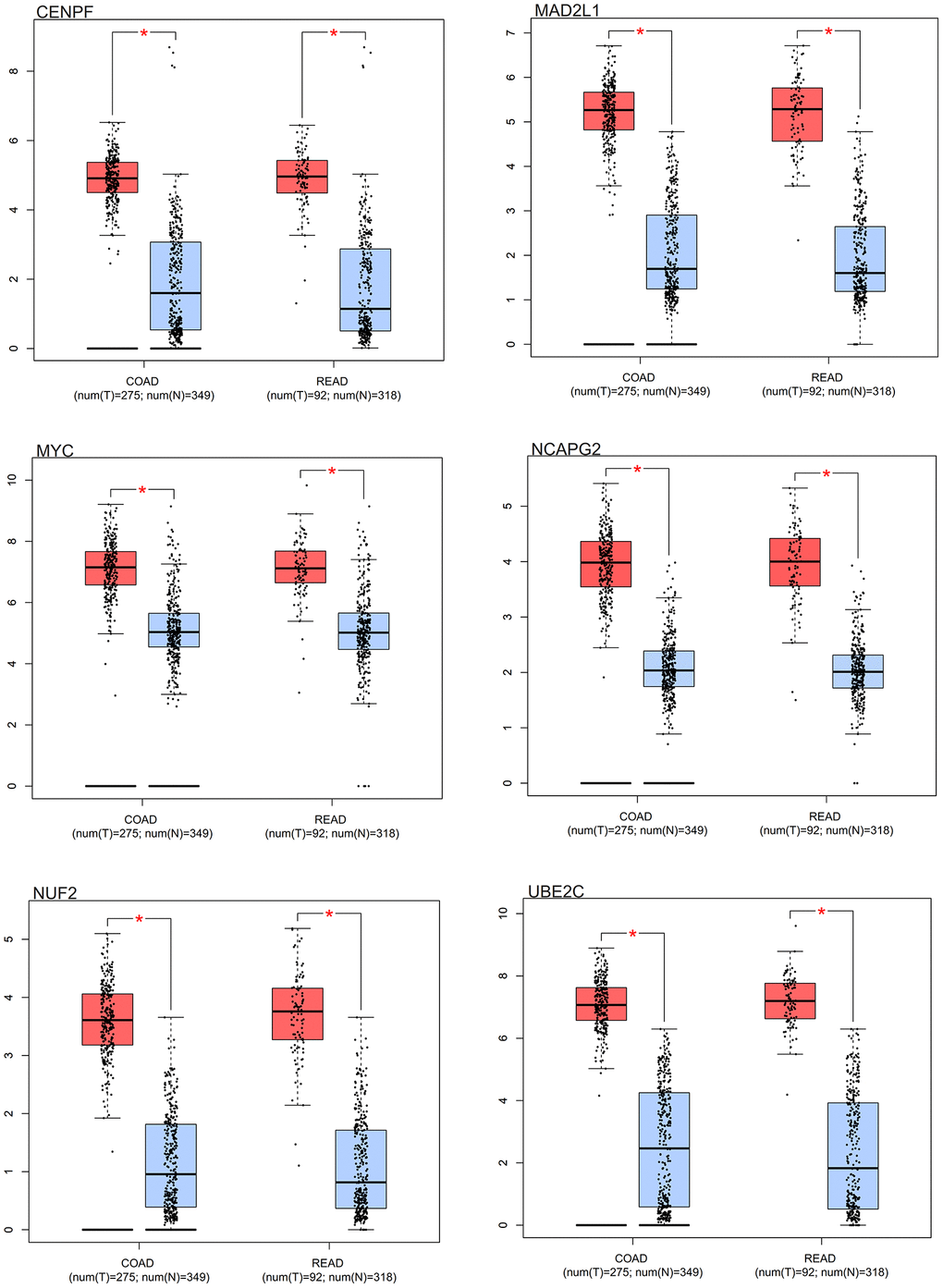 Distinct expression patterns were observed in the box plot analysis of the core genes in colorectal cancer. Notably, the core genes (MYC, MAD2L1, CENPF, UBE2C, NUF2, NCAPG2) had differential expression in colorectal cancer samples in comparison to normal samples. As elegantly illustrated in Figure 10, these core genes showed an increased expression in colorectal cancer samples, contrasting with a decreased expression in normal samples.
