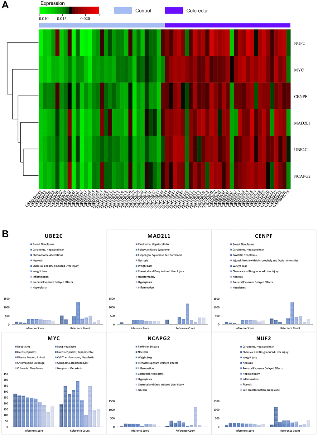 As part of this research, we submitted the cluster gene list to the CTD website, which provided valuable insights into the diseases closely associated with the cluster genes. Specifically, the core genes (MYC, MAD2L1, CENPF, UBE2C, NUF2, NCAPG2) showed associations to colorectal neoplasia, tumour cell transformation, inflammation and necrosis, as elegantly illustrated in Figure 11B. This nuanced exploration has deepened our understanding of the intricate interplay between these core genes and a variety of disease processes.