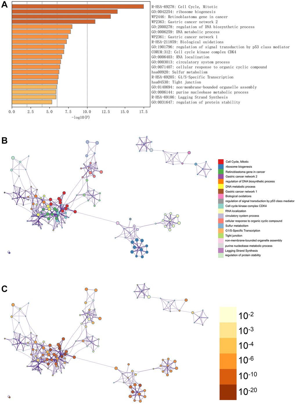 In Figure 3A, the GO enhancement project unfolds graphically in the Metascape enrichment exploration. Simultaneously, we generated an output visualising the enrichment network, where the colouring reflects the enrichment terms and their corresponding p-values (Figures 3B, 3C and 4). This visual representation artfully conveys the interconnectedness and confidence of each enrichment term, enhancing clarity and depth of understanding.