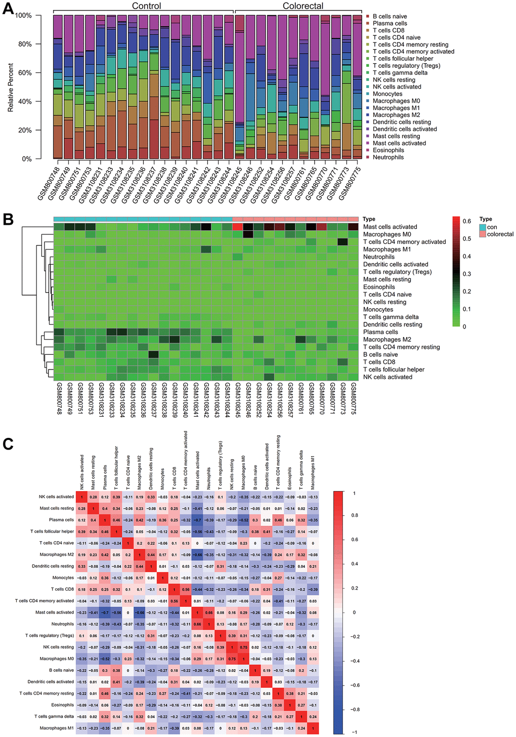 Insights into immune cell composition were obtained by comprehensive analysis of the combined matrix from the colorectal cancer datasets GSE32323 and GSE113513 by means of the CIBERSORT software package. The proportions of immunological cells within the total genomic pattern were determined at a 95% confidence level. In particular, M2 and activated mast cells were found to be dominant components in these samples (Figure 5A).