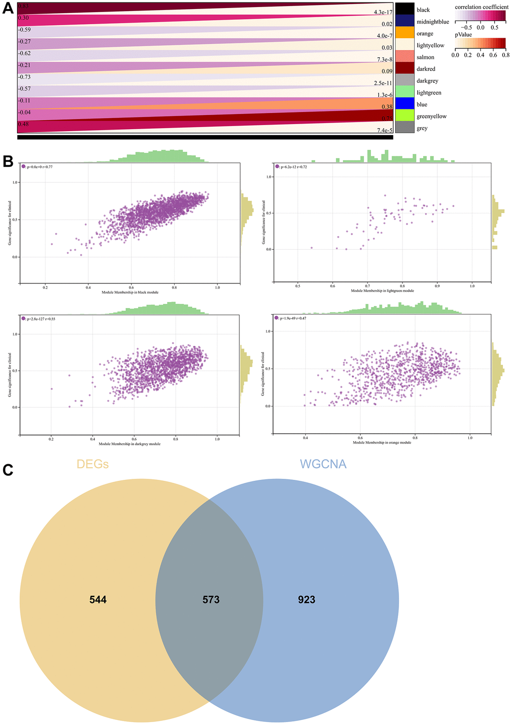 We performed correlations between module signature vectors and gene abundance, emphasising a strict cutting standard (|MM| >0.8), to identify critical hub genes. Ten strongly associated genes in clinically meaningful modules were clustered as hub genes. To further elucidate the molecular landscape, a Venn diagram was constructed to illustrate the overlap between genes identified by WGCNA and those identified as DEGs (Figure 7C).