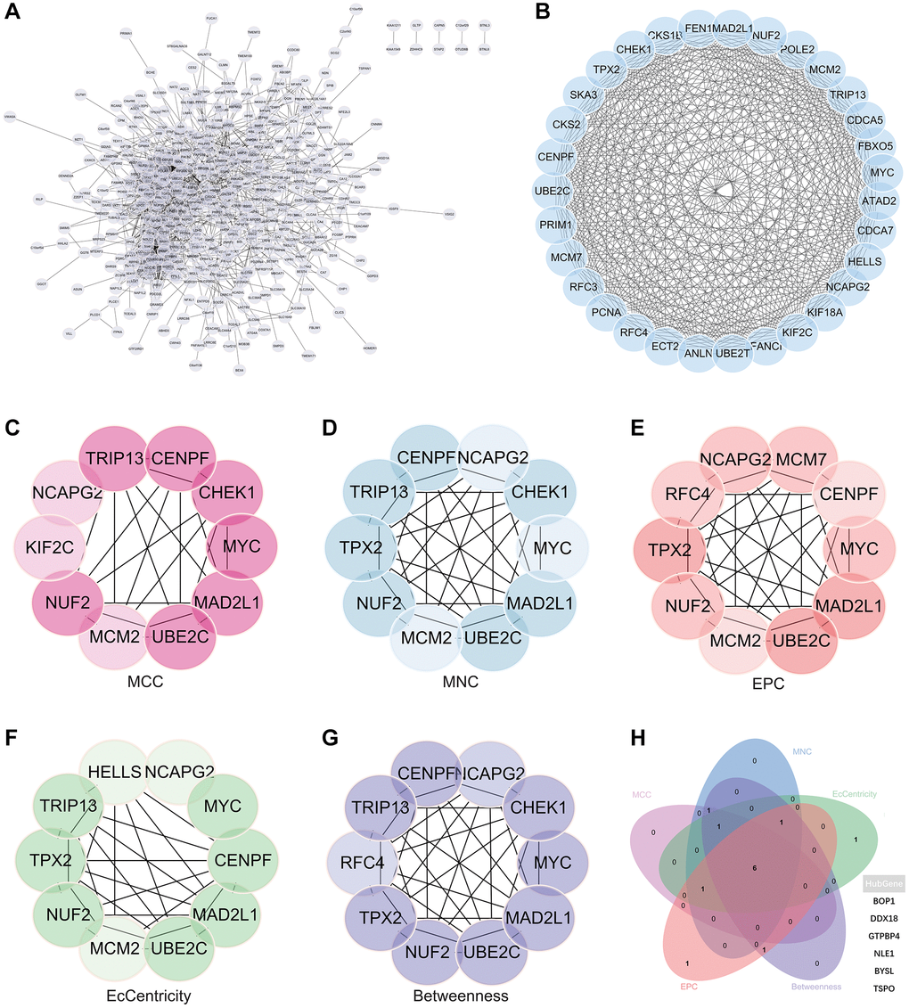 In an effort to identify central genes within this network, we applied five different algorithms (MCC, MNC, EPC, EcCentricity, Betweenness), which resulted in the identification of potential central genes, each of which is shown in Figure 8C–8G. An elaborate Venn diagram analysis merging the results of these algorithms accurately pinpointed the core genes, as depicted in Figure 8H. At the end of this analysis, six genes (MYC, MAD2L1, CENPF, UBE2C, NUF2 and NCAPG2) emerged as the focal points of interest within the complex molecular landscape.