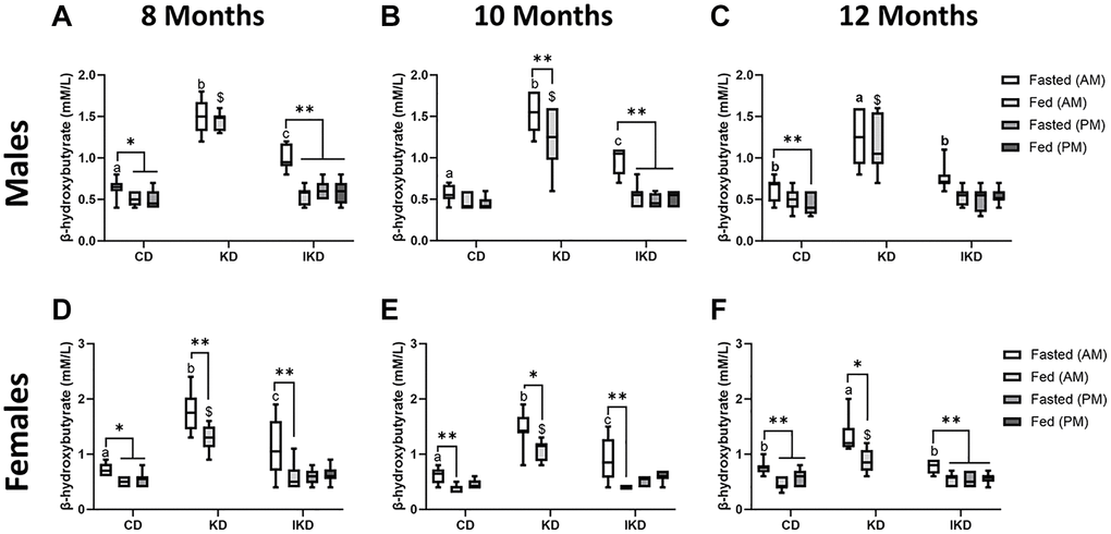 Blood β-hydroxybutyrate measurements were taken from TgF344-AD animals of the 12-month Tg group at 8, 10, and 12 months of age. Ketone measurements were not taken in CD after the evening meal, nor in KD group pre- or post-evening meal, as the diet composition consumed in the evening matched that of the morning meal. Prior to the morning meal, blood ketone levels were highest in the KD-fed animals, lowest in the CD-fed animals, with IKD being intermediate. These levels were significantly different among all diet group in males and females at 8- and 10-months (Figure 2A, 2B, 2D, 2E). However, at 12 months, the IKD ketone levels were no longer different from the CD and only the KD group was different from the other diet groups (Figure 2C, 2F). Postprandially, ketone levels in both the CD and IKD groups dropped in response to the morning CD meal, but the KD-fed group remained significantly elevated in the males and only showed a postprandial decrease in the females. IKD fed animals did not show an increase in blood ketone levels postprandially to the evening KD meal (Figure 2., Fed PM) at any age.