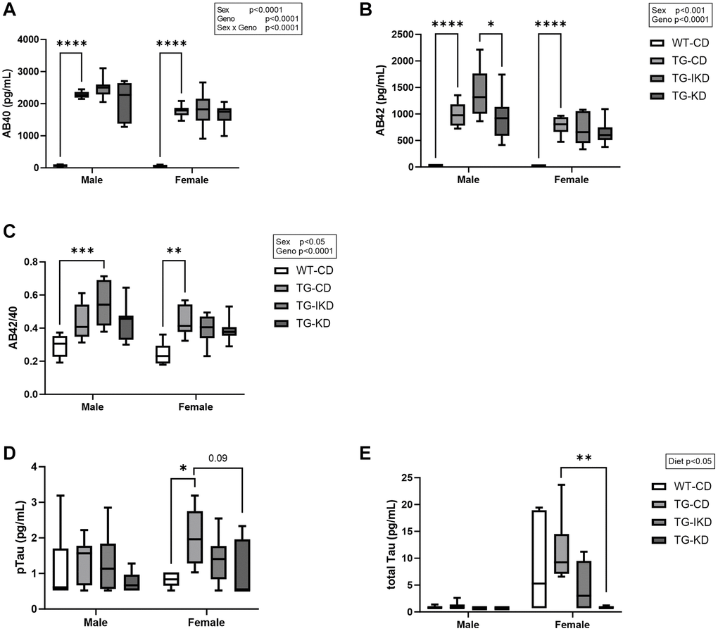 Amyloid beta (Aβ) 40, Aβ42, phosphorylated Tau 181 (pTau) and total Tau (tTau) were measured in plasma samples collected at 12 months of age (Figure 3). Males were found to have significantly elevated Aβ40, Aβ42 and Aβ42/40 ratio compared to females (Figure 3A–3C, sex main effect, p < 0.05). While there was a genotype main effect with Tg-CD animals exhibiting significantly elevated Aβ40, 42 and Aβ2/40 ratio compared to WT-CD, neither IKD nor KD ameliorated this difference. In females, pTau was significantly increased in Tg fed a CD (p < 0.05) compared to WT-CD and there was a trend (p = 0.09) for KD to mitigate elevated pTau levels (Figure 3D). In addition, KD significantly reduced tTau compared to Tg-CD female rats (Figure 3E, p < 0.01).