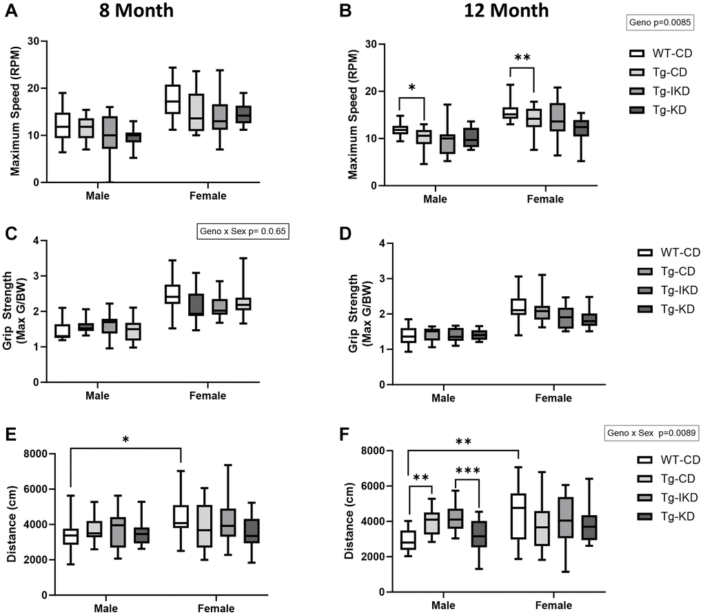 Grip strength performance was not impacted overall by diet or genotype at either age tested. However, there was a sex effect where females exhibited improved grip strength (max G/BW) over males (Figure 4C, 4D, p < 0.001). Furthermore, there was a sex x genotype interaction at 8 months of age where female WT-CD tended to perform better than Tg-CD, but this was not observed in males.