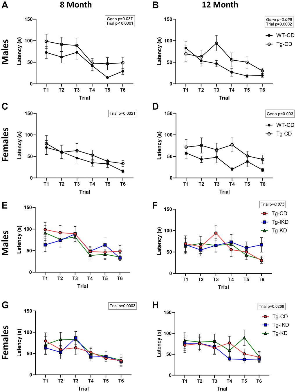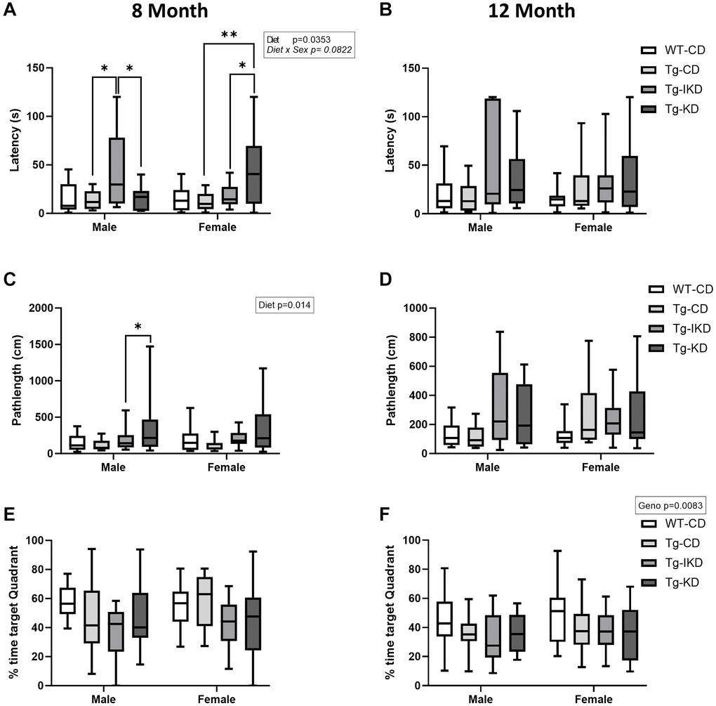 At 8 months of age, Tg males on a CD showed spatial learning memory impairment during the training phase as assessed by the Barnes maze (Figure 5A, p < 0.05), while 12-month-old males showed a strong trend toward impaired spatial learning memory (Figure 5B, p = 0.068) compared to WT. In females, impaired performance in the Barnes maze test was observed in the 12-month-old, but not 8-month-old, rats (Figure 5C, 5D, p < 0.01). Neither KD nor IKD improved performance in the Barnes maze task and there were no differences between the CD, IKD, and KD groups in Tg male and female rats for Barnes maze training (Figure 5E–5H). During the probe trial, there was an overall genotype effect in which Tg rats at 12, but not 8, months of age spent significantly decreased % time in the target quadrant (Figure 6E, 6F, p < 0.01). There were significant (p < 0.05) diet effects on latency and pathlength to the target at 8 months of age in the Tg animals, and there was a trend for diet x sex interaction for latency (Figure 6A, 6C). However, these differences in the probe trial did not continue at 12 months of age and no differences between Tg diet groups were observed in the 12-month-old rats (Figure 6B, 6D).
