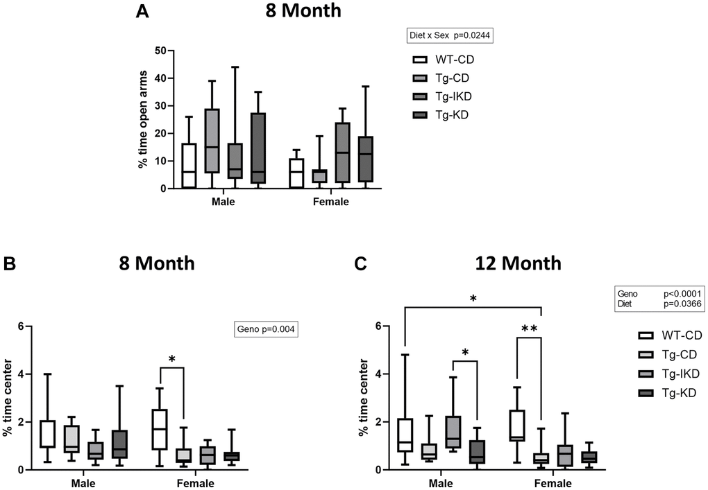 To assess anxiety, 8-month-old rats were tested on the elevated plus maze (Figure 7A). In addition, time spent in the center of the open field was assessed as a potential indicator of anxiety in both 8- and 12-month-old rats (Figure 7B, 7C). There was no genotype or diet effect in the elevated plus test, although there was an overall effect of sex on % time spent in open arms with female rats tending to spend reduced time in the open arms compared to males (Figure 7A, p < 0.01). When using % time in the center of the open field as a measure of anxiety, Tg animals showed decreased time in the center compared to WT at both 8 and 12-months of age (Figure 7B, 7C, p < 0.05). In addition, there was a diet effect at 12 months of age (p < 0.05) with male Tg animals on a IKD diet spending significantly more time in the center than KD and a strong trend toward more time than CD (p = 0.0525).