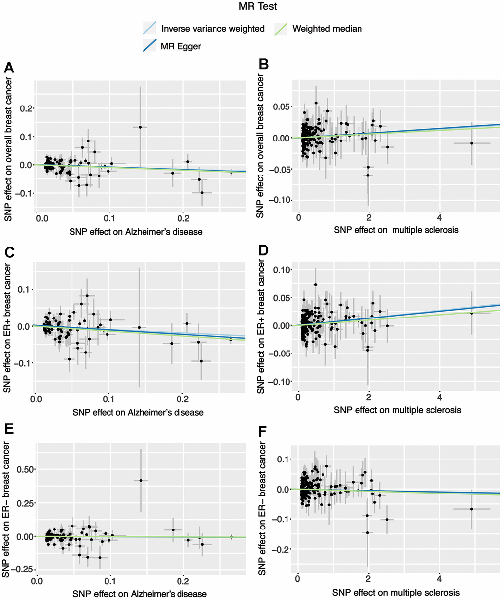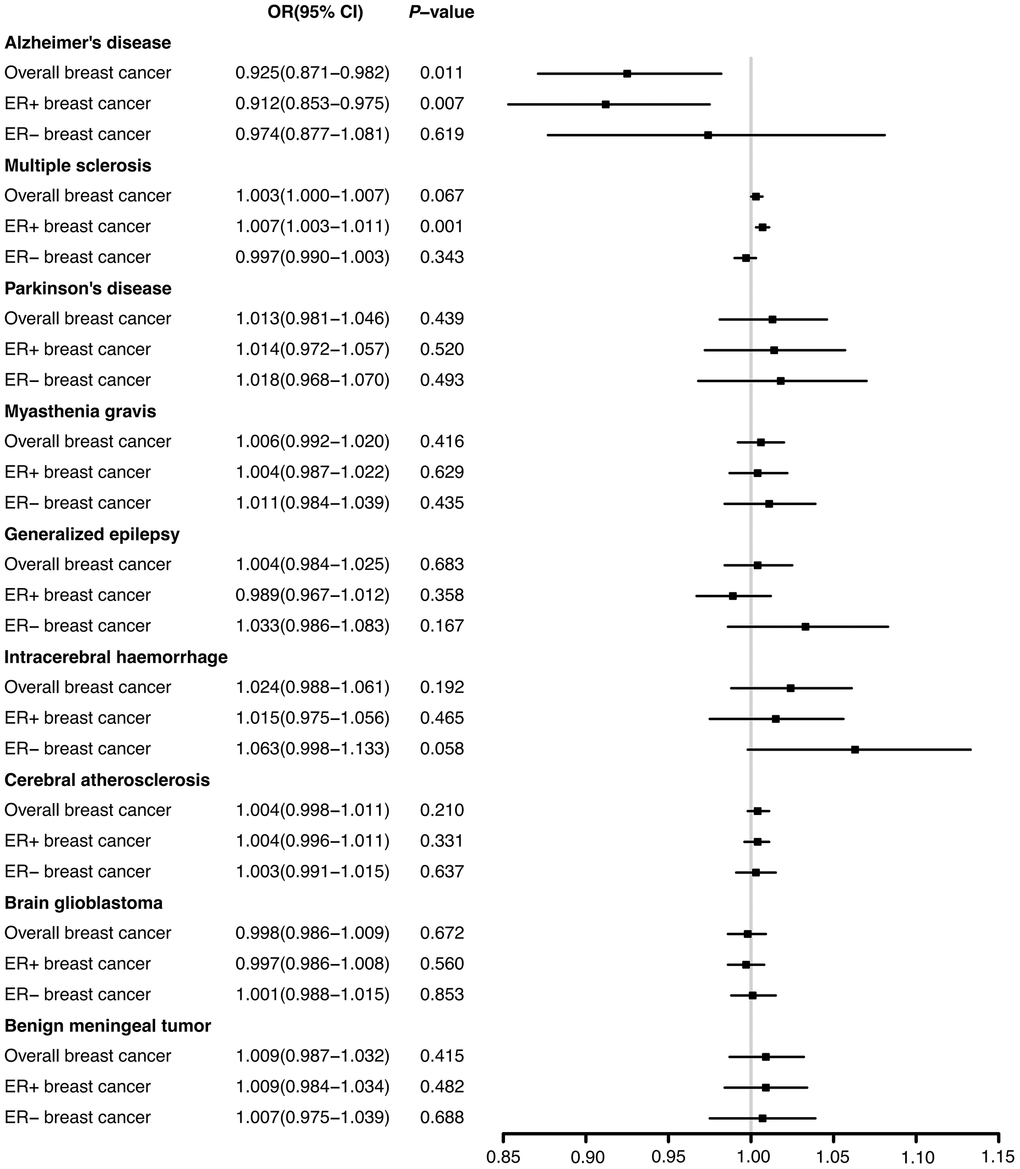 Overall, based on the results of this comprehensive MR study, Alzheimer’s disease tends to be negatively correlated with ER+ breast cancer, while multiple sclerosis has a trend towards a positive association, which can help the prevention of breast cancer in clinical practice. However, this study can only obtain trends rather than clear causal relationships between them on account of the limitations of MR analyses. In the future, the accurate results will be demonstrated with more prospective experimental designs, such as randomized controlled trials and cohort studies.