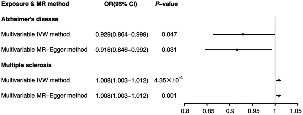 As Alzheimer’s disease and multiple sclerosis are genetically linked, there may have been false-positive results in the two-sample MR analyses. We then conducted multivariable IVW and multivariable MR-Egger analyses so that we could assess the causal connections between these two diseases and breast cancer. Using the “MendelianRandomization”, “TwoSampleMR”, “data.table”, “VariantAnnotation” packages of R version 4.2.3, statistical analyses were performed.