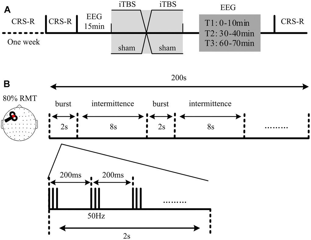 A randomized double-blind, crossover experimental was set up (Figure 1A). Each patient received both a real and sham iTBS in a randomized order. A computer-generated randomization sequence was used to assign, the first session as either a real or sham stimulation. For each patient, the experimenter received two blinded codes from a third person, one for the real stimulation and one for the sham stimulation. Before each stimulation, patients received CRS-R and fifteen minutes of resting-state EEG recording. In order to capture the modulation effects of iTBS on patients’ brain activities, 70 minutes of resting-state EEG followed by CRS-R was conducted immediately after the stimulation. The real and sham stimulations had at least a three-day washout period in between. To evaluate the long-term functional outcomes, we followed up with the Glasgow Outcome Scale Extension (GOS-E) scores at 6 months post-experiment via a phone call.