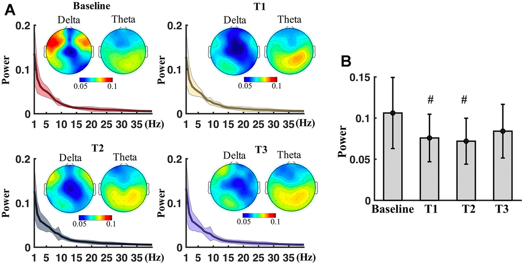 There was no significant difference of global average spectrum between T1, T2, T3 and baseline in the real stimulation. Topography indicated a decreasing of delta power and an increasing of theta power (Figure 2A). There was no significance of the frontal average delta power among the different time points (F3,71 = 3.45, p>0.05). No significance in the pairwise comparisons of the frontal average delta power. However, the frontal average delta power of T1 (p = 0.03) and T2 (p = 0.04) were significantly lower than that of baseline before multiple comparison correction (Figure 2B). Sham stimulation did not induce any significant changes of spectrum power of EEG.