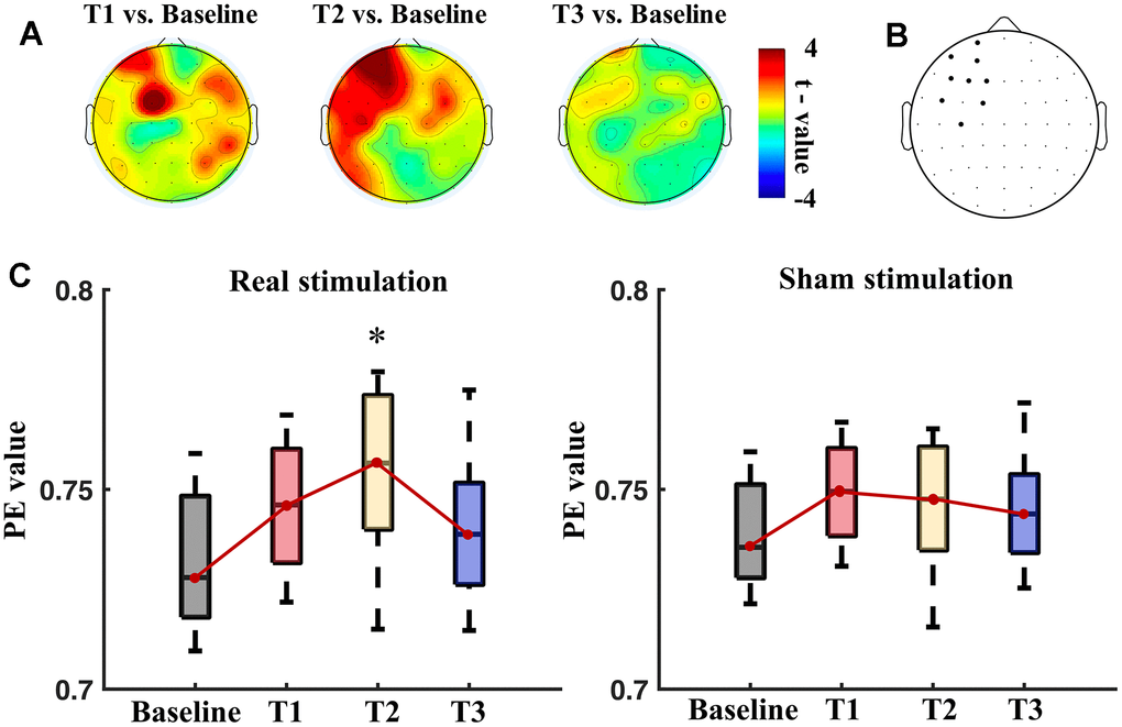 Figure 3C shows the boxplots of average PE values of the left frontal region (including FP1, AF3, AF7, F1, F3, F5, FC1, FC5 and C3) of the patients at different time points. There was significant difference between time points in the real stimulation (F3,71 = 5.12, p = 0.008), but not in the sham stimulation (F3,71 = 1.69, p > 0.05). Post-hoc t-tests showed a significant increase of the PE values at T2 than the baseline (p=0.003, paired t-tests with Bonferroni correction) after the real stimulation. The sham stimulation did not significantly alter the average PE values of the left frontal region.