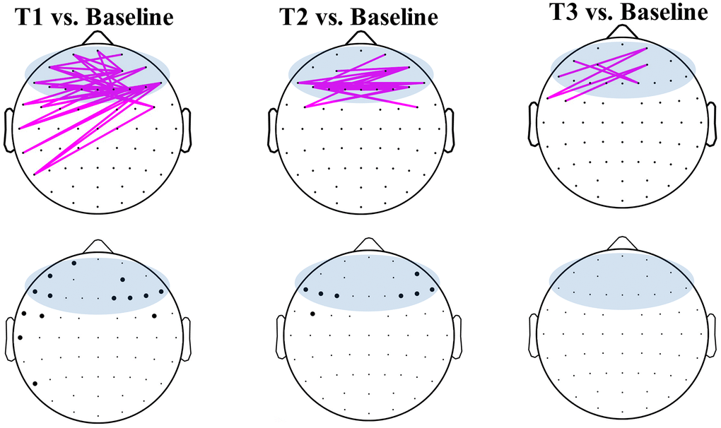 The functional connectivity was indexed by wPLI and measured at the baseline and post-stimulation time points for the pairwise electrodes. Figure 4 shows the significantly strengthened connectivity by the real stimulation (p<0.05, paired t-tests with FDR correction). The significantly strengthened connectivity were mostly relevant with electrodes at frontal region. Consistently, the electrodes, which showed significant increasing of connectivity degree, were mainly located at bilateral frontal regions (lower panel of Figure 4) at T1 and T2.