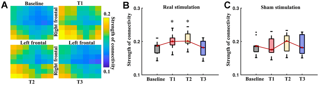 Inter-hemispheric connectivity of frontal regions showed marked increasing at T1 and T2 in comparison with baseline (Figure 5A) after the real stimulation. The average strength of frontal inter-hemispheric connectivity showed significant difference in the time points of the real stimulation (F3,71 = 17.33, p < 0.001), but not in the sham stimulation (F3,71 = 0.89, p > 0.05). Post-hoc t-tests showed a significant increase at T1 (p=0.03, paired t-tests with Bonferroni correction) and T2 (p=0.008) after real stimulation than that at the baseline (Figure 5B). There was no significant difference between T3 and baseline in the real stimulation. The sham stimulation did not induce any significant change of the inter-hemispheric connectivity at the T1, T2 and T3 between that of the baseline (Figure 5C).