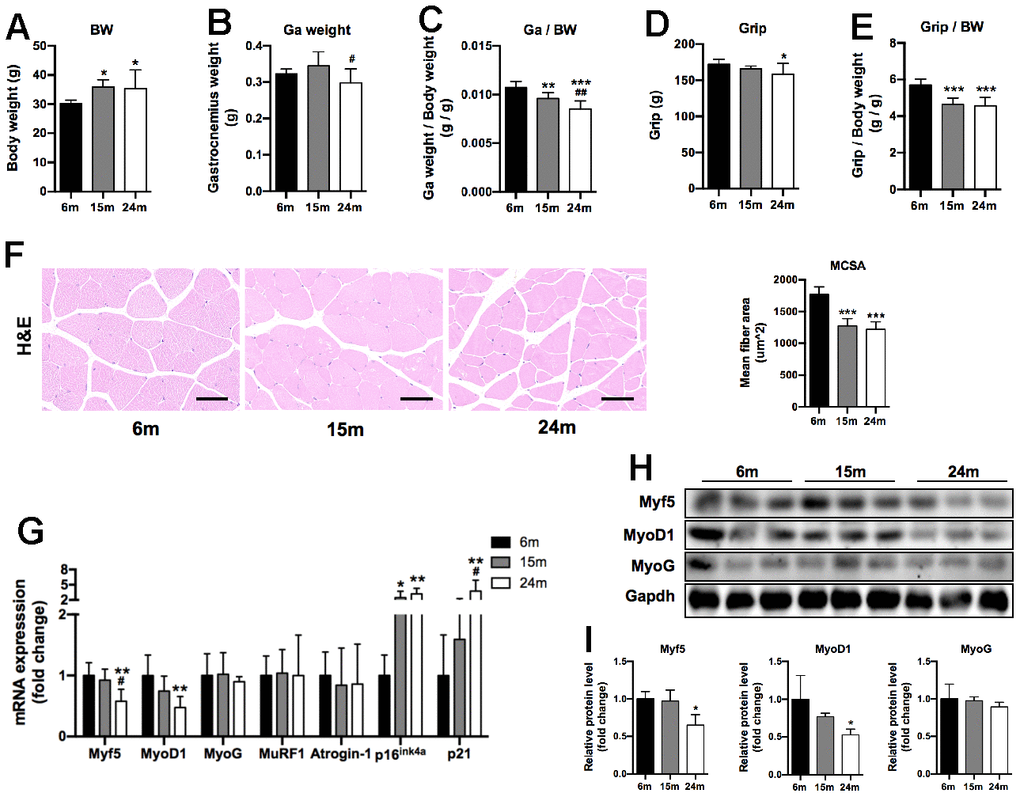 Compared to 6m group, the body weight (BW) of 15m and 24m groups significantly increased (1.2-fold, p<0.05) (Figure 1A), while the Gastrocnemius (Ga) weight of 24m group significantly decreased by 14% compared to 15m group (p<0.05) (Figure 1B). Moreover, we observed age-related decline when Ga weight was corrected by BW (Ga/BW) (Figure 1C). Four-limb grip strength was attenuated in 24m group compared to 6m group (8% lower) (p<0.05) (Figure 1D). Consistently, the ratio of grip strength (Grip) to BW (Grip/BW) significantly reduced by about 20% in 15m and 24m groups compared to 6m group (p<0.001) (Figure 1E). Representative H&E staining images of SM section were shown in Figure 1F, and the myocyte cross sectional area (MCSA) was lower in 15m (28% lower) and 24m (30% lower) groups than in 6m group (P<0.001). As shown in Figure 1G, the mRNA levels of senescence-associated markers p16ink4a and p21 increased with advancing age. The mRNA expression of MuRF1 and Atrogin-1 involved in muscle degradation showed no significant difference among three groups, while both mRNA (42% lower for Myf5, 53% lower for MyOD1) and protein (35% lower for Myf5, 47% lower for MyOD1) levels of myogenic regulatory factors Myf5 and MyoD1 significantly decreased in 24m group compared to 6m group (Figure 1G–1I).