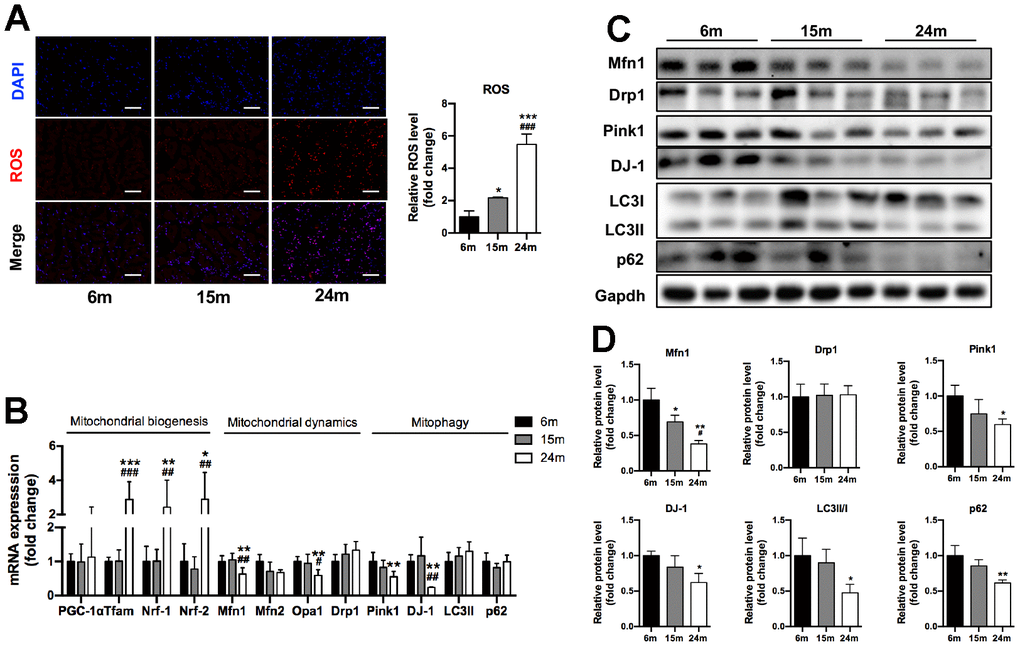 The high-energy SM is composed of a large number of mitochondria and the maintenance of mitochondrial integrity and function is critical for muscle health. Using immunofluorescence staining, we found that the ROS production (stained as red fluorescence) in SM significantly increased with aging (2.2-fold for 15m group, 5.5-fold for 24m group, both compared to 6m group, P<0.05) (Figure 2A). As shown in Figure 2B, the mRNA levels of mitochondrial biogenesis factors Tfam, Nrf-1, and Nrf-2 significantly increased in 24m group compared to 6m and 15m groups. Interestingly, the mRNA expression of mitochondrial dynamics factors Mfn1 (36% lower), Opa1 (40% lower) and mitophagy factors Pink1 (45% lower) and DJ-1 (22% lower) significantly decreased in 24m group compared to 6m group (p<0.01), while the mRNA expression of mitochondrial dynamics factors Mfn2 and Drp1, autophagy-related factors LC3 and p62 showed no difference among three groups (Figure 2B). As shown in Figure 2C, 2D, the protein expression of Mfn1 (62% lower), Pink1 (40% lower), DJ-1 (38% lower), LC3II/I (52% lower), p62 (39% lower) significantly decreased in 24m group, compared with 6m group (p<0.05), and Mfn1 protein expression significantly decreased by 31% in 15m group compared to 6m group (p<0.05).