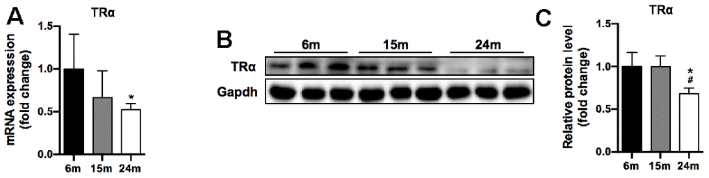 In our study, TRα mRNA level significantly decreased by 48% in 24m group compared to 6m group (p<0.05) (Figure 3A). Moreover, TRα protein level significantly decreased by 32% in 24m group compared to 6m and 15m groups (p<0.05), yet no significant difference between 6m and 15m groups (Figure 3B, 3C).