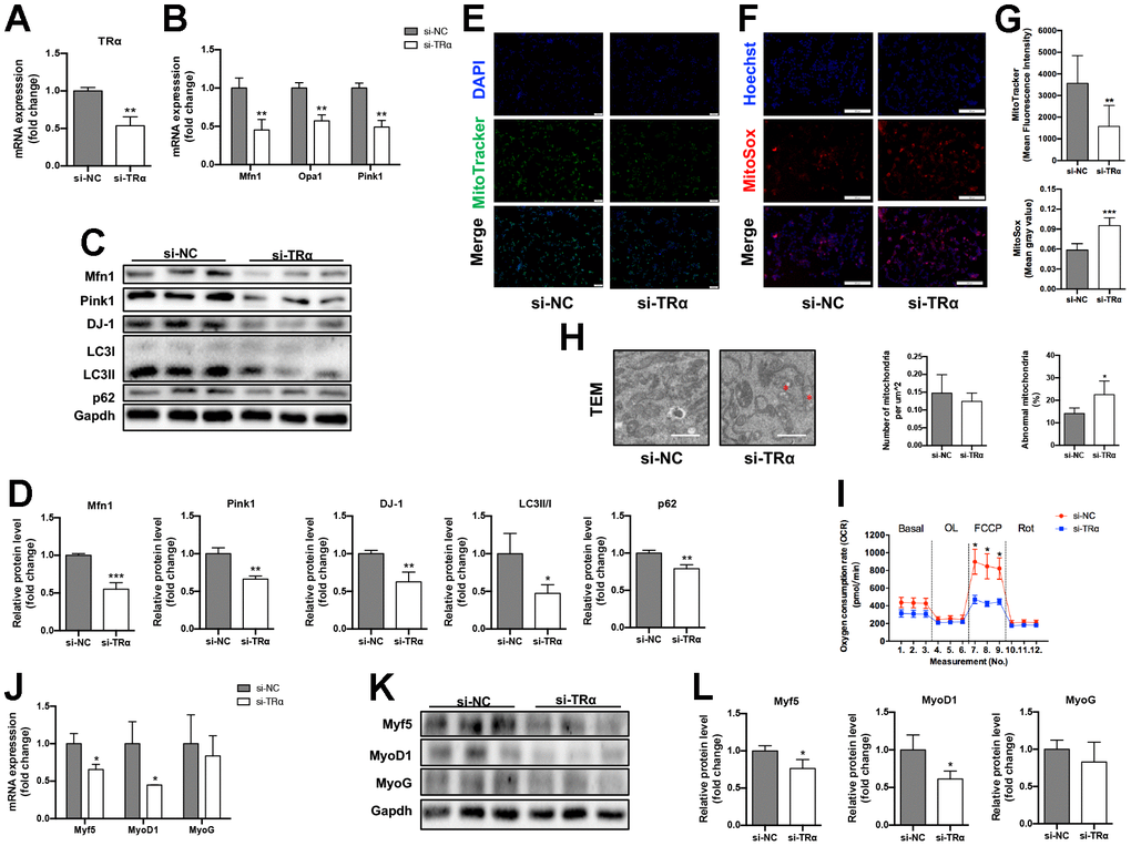 To investigate whether TRα regulates mitochondrial dynamics, autophagy, function or myogenesis, TRα-targeted siRNA (si-TRα) was constructed and transfected into C2C12 cells, with non-targeted siRNA (si-NC) as a control. si-TRα transfection successfully decreased TRα expression by 47% (P<0.01) (Figure 4A). Meanwhile, the mRNA expression of Mfn1 (55% lower), Opa1 (43% lower), and Pink1 (51% lower) significantly decreased (p<0.01) in si-TRα group compared to the control (Figure 4B). Consistently, the protein levels of Mfn1 (45% lower), Pink1 (34% lower), DJ-1 (38% lower), LC3II/I (53% lower), and p62 (21% lower) were significantly down-regulated (Figure 4C, 4D). Interestingly, silencing of TRα also led to a significant decrease (56% lower) in mitochondrial activity measured by MitoTracker immunofluorescence staining, higher (1.6-fold) mitochondrial ROS assessed by MitoSox immunofluorescence staining, and higher (1.6-fold) percent of damaged mitochondria, while no significant difference was observed in mitochondrial number measured by electron microscopy (Figure 4E–4H). Notedly, we also observed decreased (48% lower) oxygen consumption rate (OCR) stimulated by the mitochondrial uncoupler FCCP using a Seahorse Bioscience XF24 respirometry analyzer (Figure 4I). In addition, Myf5 and MyoD1 mRNA (34% lower for Myf5, 55% lower for MyOD1) and protein (24% lower for Myf5, 39% lower for MyOD1) expression significantly decreased in si-TRα group (p<0.05), while MyoG was slightly down-regulated in si-TRα group compared with the control group (Figure 4J–4L).