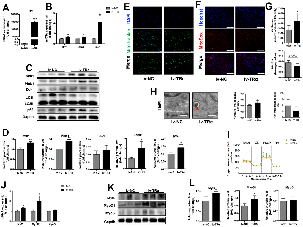 As shown in Figure 5B, accompanied by the increase of TRα expression (14779-fold, P<0.01) (Figure 5A), the mRNA expression of Mfn1 (1.3-fold), Opa1 (1.4-fold), and Pink1 (4.3-fold) significantly increased, and the protein expression of Mfn1 (1.3-fold), Pink1 (1.4-fold), LC3II/I (2.1-fold), and p62 (1.4-fold) also increased in lv-TRα group compared to the control (p<0.05), while there was only an upward trend for DJ-1 (Figure 5C, 5D). Notedly, overexpression of TRα also led to an increase in mitochondrial activity (1.7-fold) and number (1.2-fold, P<0.05), while there were only downward trends for mitochondrial ROS (22% lower, P=0.052) and percent of damaged mitochondria (43% lower, P=0.412) (Figure 5E–5H). No significant difference was observed in OCR (Figure 5I). Additionally, Myf5, MyoD1 mRNA (1.3-fold for Myf5, 2.0-fold for MyOD1) and protein (1.4-fold for Myf5, 1.5-fold for MyOD1) expression significantly increased when TRα was overexpressed (p<0.05), while MyoG expression showed no significant change (Figure 5J–5L).