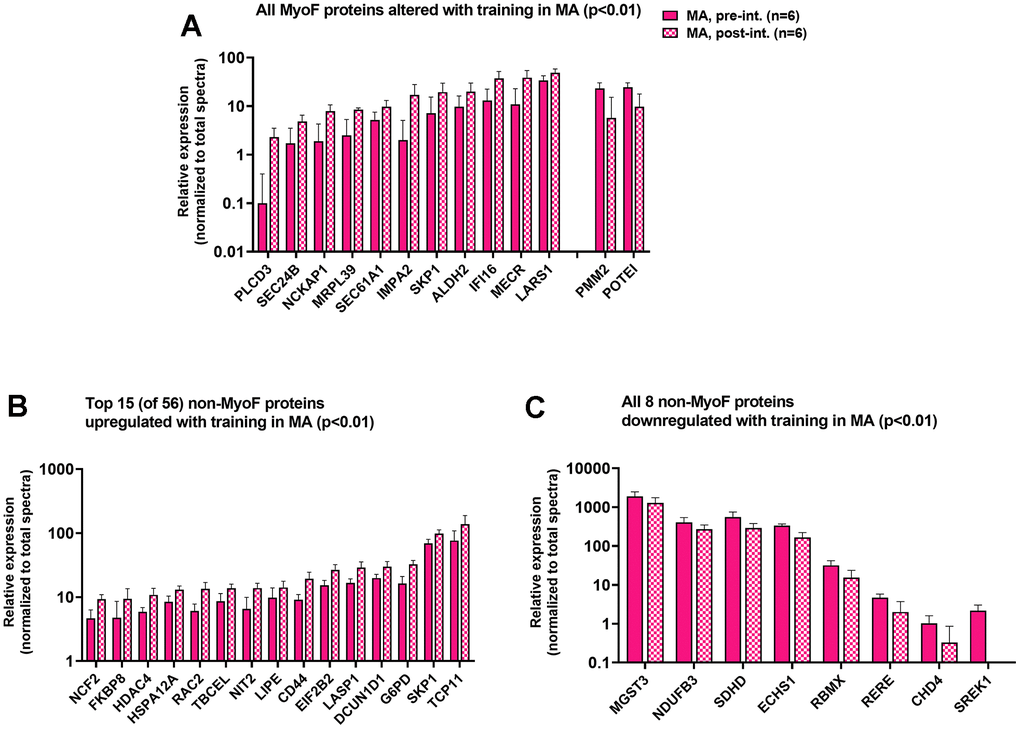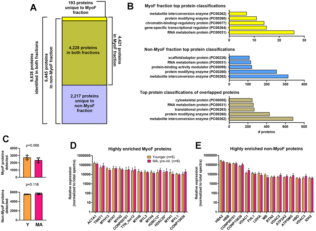 A total of 4,228 proteins overlapped in both fractions yielding 2,217 unique non-MyoF proteins, 193 unique MyoF proteins, and 6,638 unique proteins identified. Using the PANTHER Classification System classifications, the top five protein classes of MyoF proteins, non-MyoF proteins, and proteins in both fractions are presented in Figure 1B. The top 15 enriched MyoF and non-MyoF proteins in MA (pre-intervention) and Y are presented in Figure 1D, 1E. None of the 15 MyoF or non-MyoF proteins met the p<0.01 significance criteria between age cohorts.